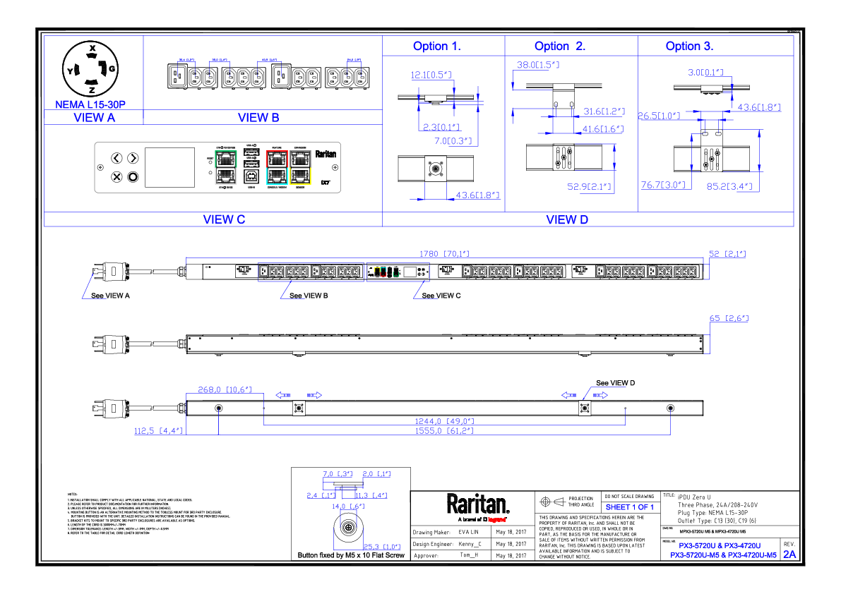 3PH, 208V AC, 30A (24A/PH rated); 36 outlets: 30x C13, 6x C19; plug: NEMA L15-30P (Delta Top-top feed), 8.6kVA; Outlet Metered/Switched, Zero U vertical PDU, SecureLock ready, high resolution color display with field replaceable controller, Ethernet, serial, 2x USB-A, USB-B and sensor connections