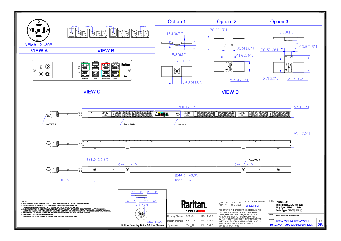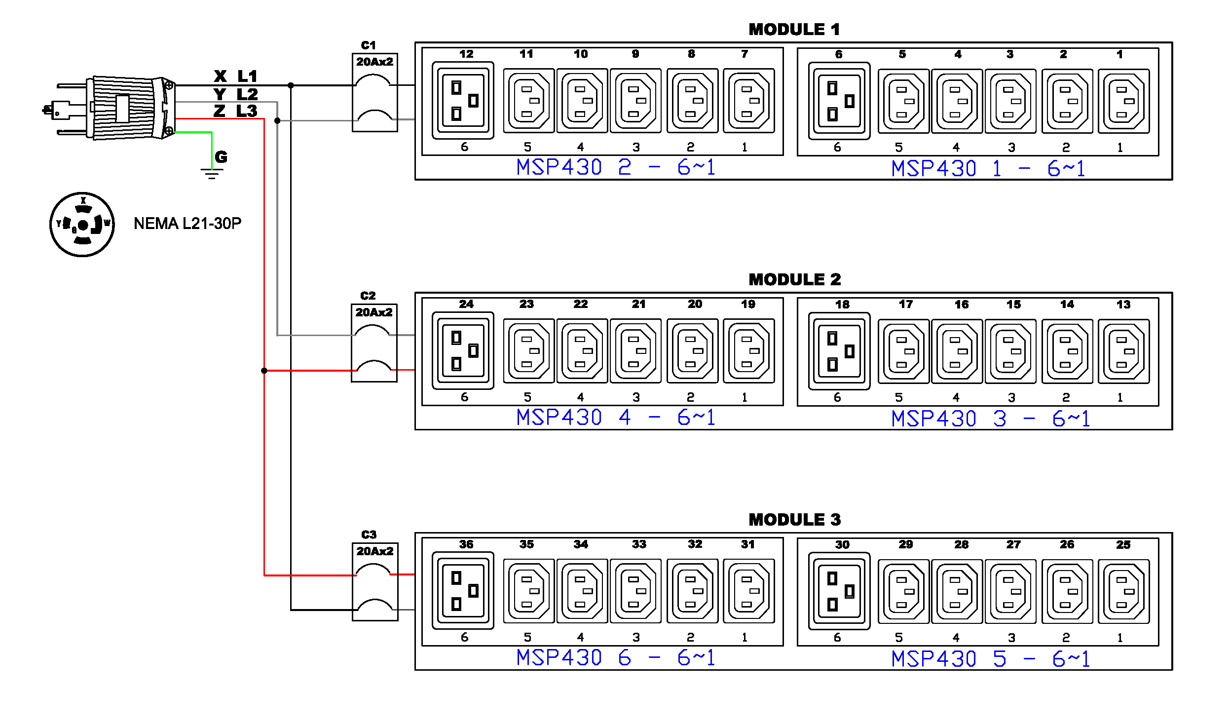 3PH, 208V AC, 30A (24A/PH rated); 36 outlets: 30x C13, 6x C19; plug: NEMA L21-30P (Wye Top-top feed), 8.6kVA; Outlet Metered, Zero U vertical PDU,