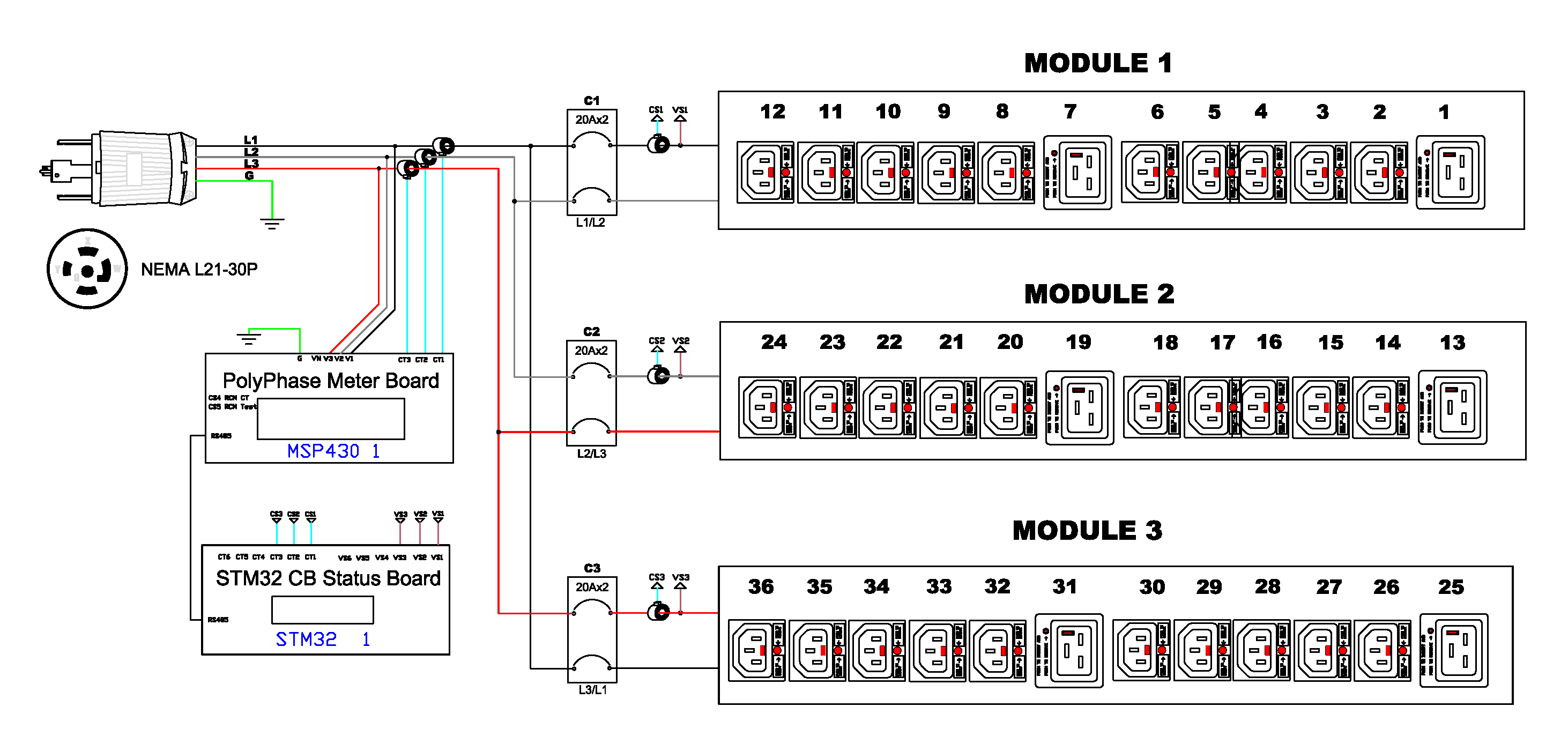 Monitored rack power distribution unit (0U [vertical], 8.6kVA, 36 outlets). INPUT: 208v (3-phase DELTA), 30a - NEMA L21-30P plug (4P5W); OUTPUT: 30@ C13, 6@ C19 outlets; on 3@ 2-pole, 20a Overcurrent Protectors; FEATURES: Billing-Grade (+/- 1%) Energy Metering [kW, kVA, V, A, Power Factor] - per inlet, per breaker/fuse; Remote network monitoring via HTML, JSON-RPC, SSH, Telnet, MODBUS/TCP, and SNMPv3. Onboard embedded processor with minimum 536MHz clock speed, 16MB SPI Flash, and 64MB DDR2 RAM. Cascading upto 16 PDU's using single Ethernet or USB connection. Environmental monitoring [temp/humidity] capable – up to 32 sensors. Individual outlet numbers labeled on chassis. Automated deployment via TFTP, DHCP, SSH(CLI), or USB Flash Drives. WiFi Capable. USB Webcam Capable. iPad/iPhone/Android App. Dual 10/100/1000 Ethernet port. Breaker metering and alarming (0V detection). Max Dimensions 52mm x 55mm x 1981mm (2.1in x 2.2in x 78.0in). Max Weight 7.7 kg. Maximum ambient temperature 60C at full load.