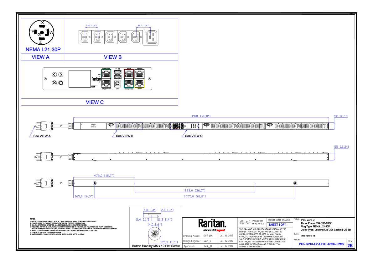 3PH, 208V AC, 30A (24A/PH rated); 36 outlets: 30x C13, 6x C19; plug: NEMA L21-30P (Wye Top-top feed), 8.6kVA; Unit Metered, Zero U vertical PDU