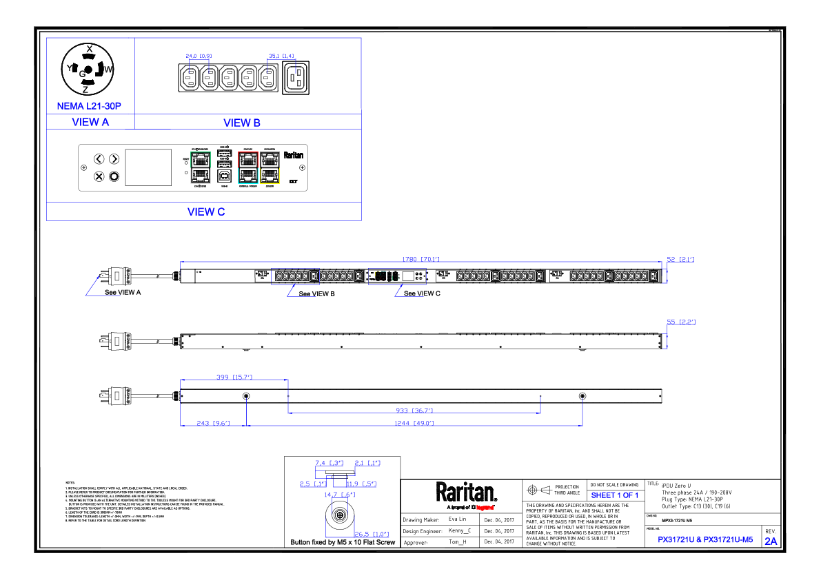 3PH, 208V AC, 30A (24A/PH rated); 36 outlets: 30x C13, 6x C19; plug: NEMA L21-30P (Wye Top-top feed), 8.6kVA; Unit Metered, Zero U vertical PDU