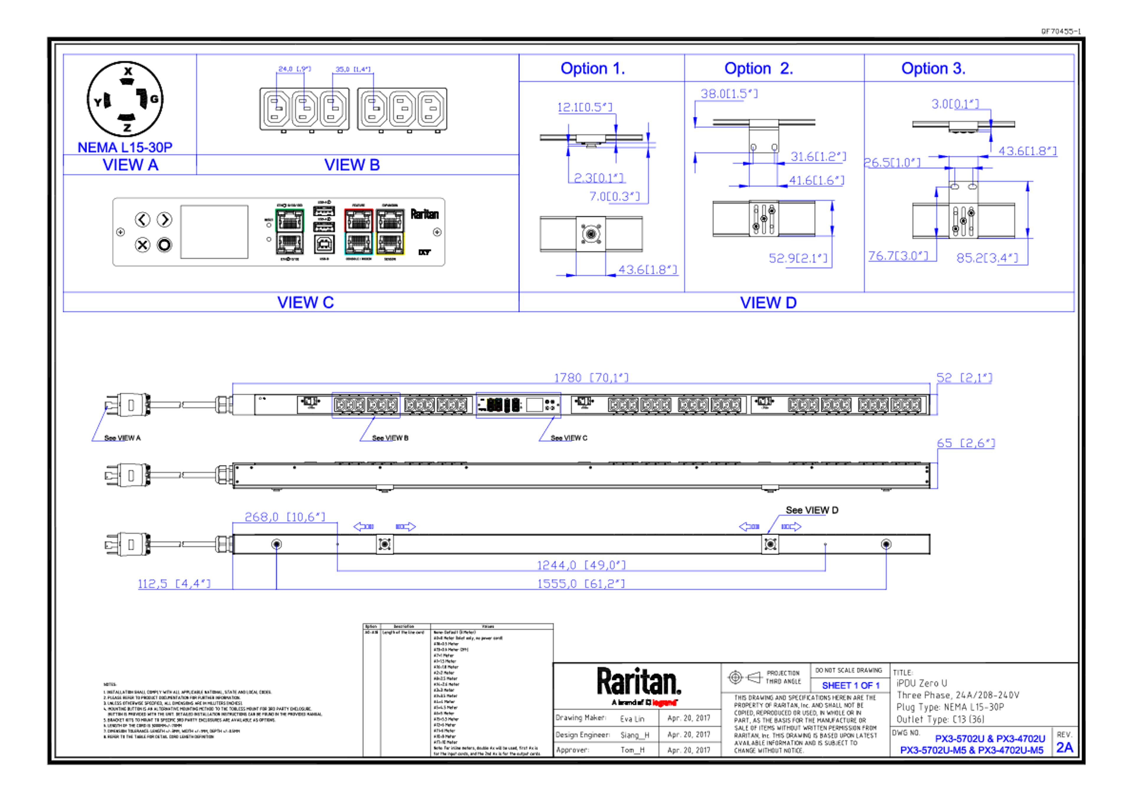 Raritan PX3-5702U 3PH 208V AC 30A 36 outlets Zero U PDU