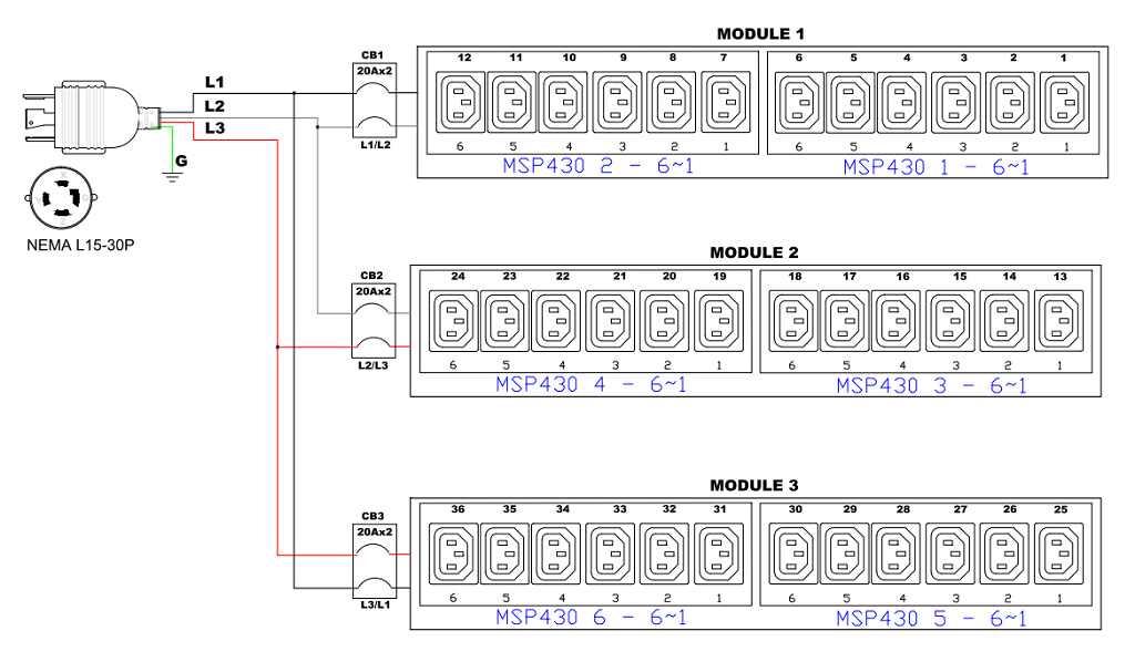 Monitored and switched rack power distribution unit (0U [vertical], 8.6kVA, 36 outlets). INPUT: 208v (3-phase DELTA), 30a - NEMA L15-30P plug (3P4W); OUTPUT: 36@ C13 outlets; on 3@ 2-pole, 20a Overcurrent Protectors; FEATURES: Billing-Grade (+/- 1%) Energy Metering [kW, kVA, V, A, Power Factor] - per inlet, per breaker/fuse, per outlet; Remote network monitoring via HTML, JSON-RPC, SSH, Telnet, MODBUS/TCP, and SNMPv3. Onboard embedded processor with minimum 536MHz clock speed, 16MB SPI Flash, and 64MB DDR2 RAM. Cascading upto 16 PDU's using single Ethernet or USB connection. Environmental monitoring [temp/humidity] capable – up to 32 sensors. Individual outlet numbers labeled on chassis. Automated deployment via TFTP, DHCP, SSH(CLI), or USB Flash Drives. WiFi Capable. USB Webcam Capable. iPad/iPhone/Android App. Dual 10/100/1000 Ethernet port. Tri-color status LED per receptacle. Breaker metering and alarming (0V detection). Max Dimensions 52mm x 65mm x 1780mm (2.1in x 2.6in x 70.1in). Max Weight 7.1 kg. Maximum ambient temperature 60C at full load.