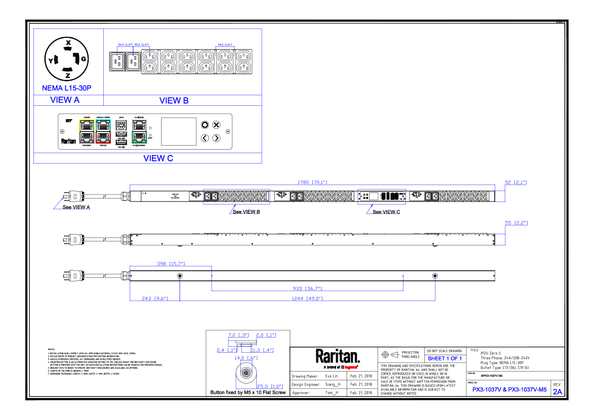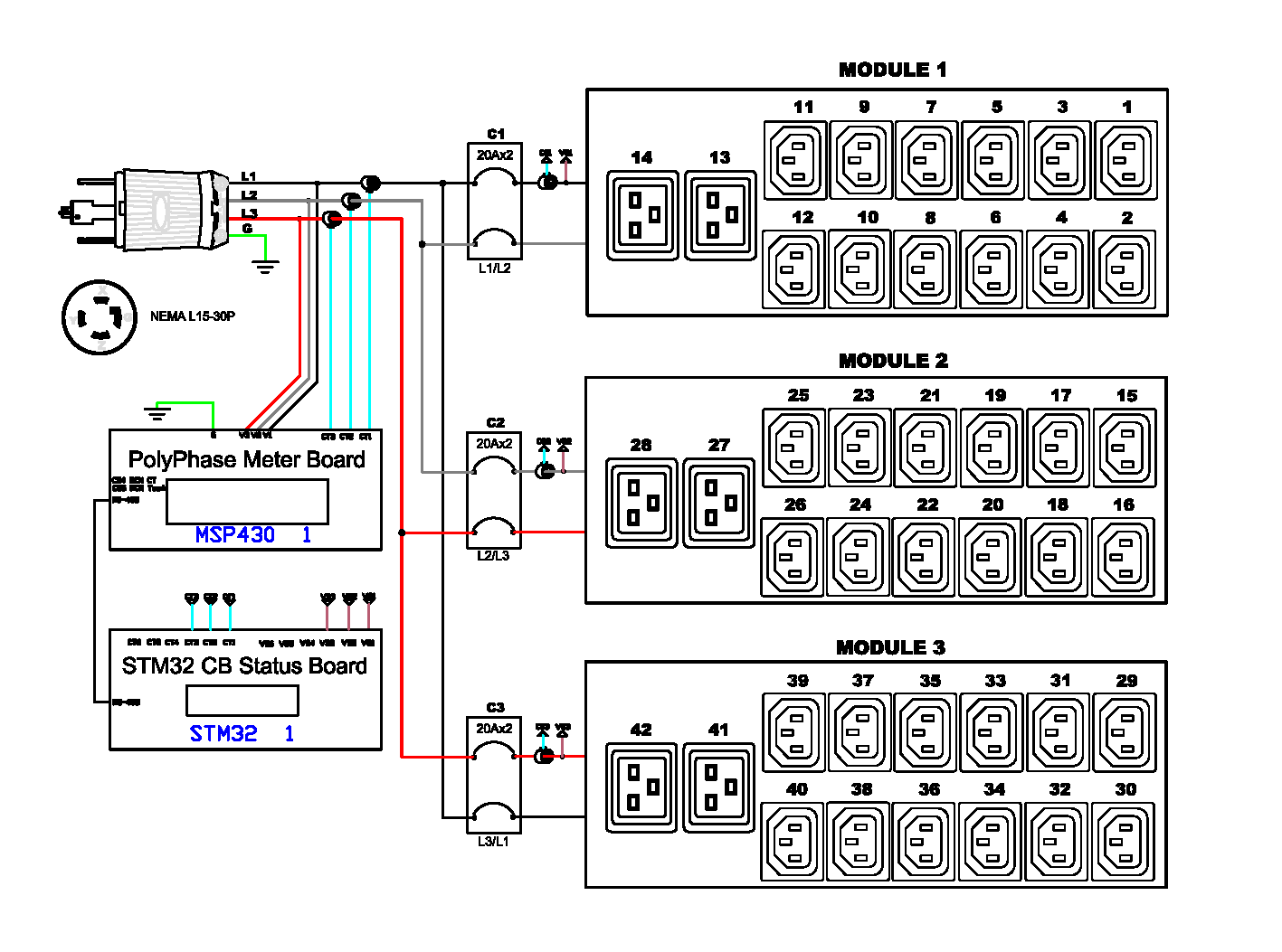 3PH, 208V AC, 30A (24A/PH rated); 42 outlets: 36x C13, 6x C19; plug: NEMA L15-30P (Delta Bottom-bottom feed), 8.6kVA; Unit Metered, Zero U vertical PDU