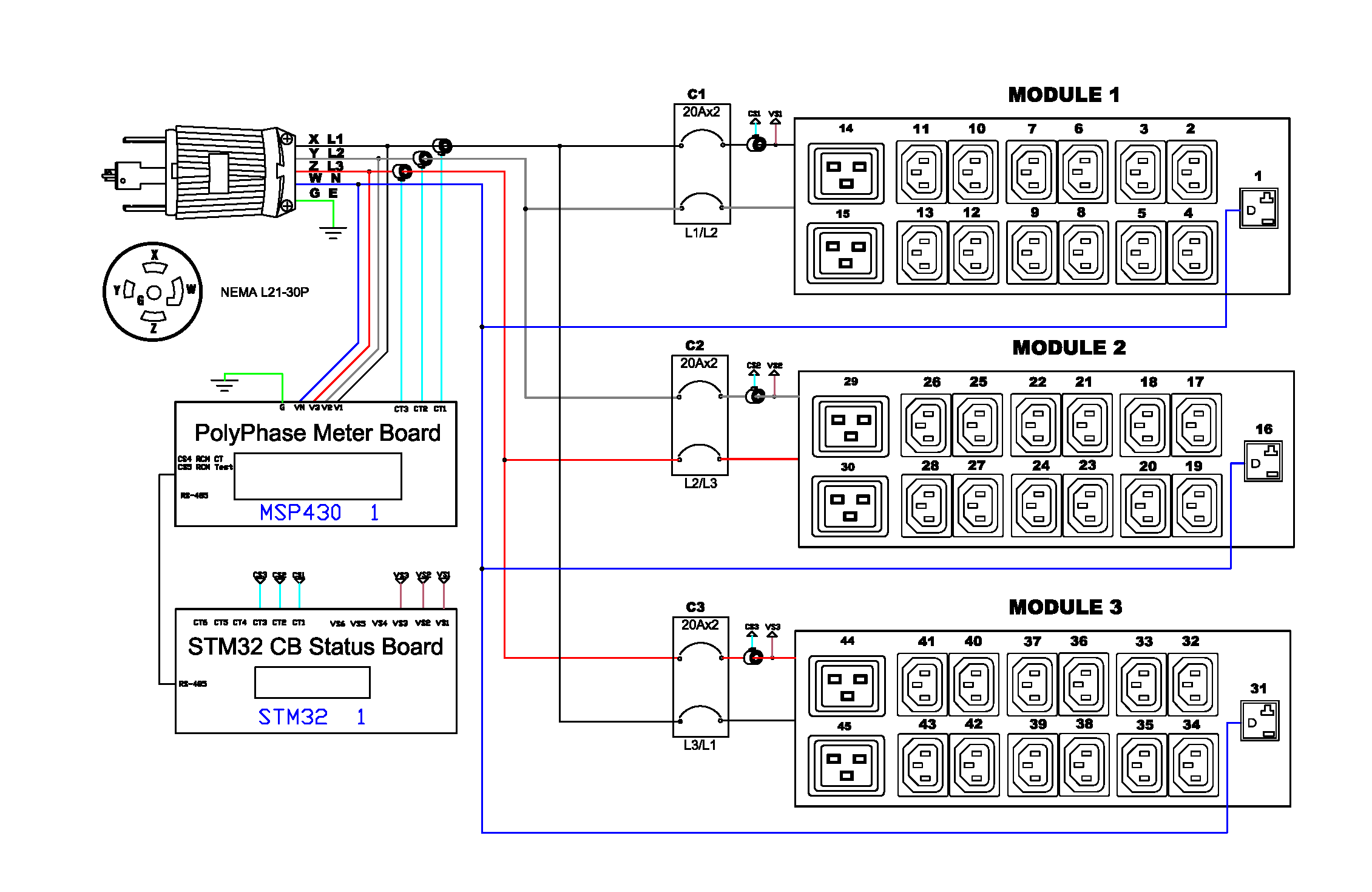 Monitored rack power distribution unit (0U [vertical], 8.6kVA, 45 outlets). INPUT: 208v (3-phase WYE), 30a - NEMA L21-30P plug (4P5W); OUTPUT: 36@ C13, 6@ C19 outlets; on 3@ 2-pole, 20a Overcurrent Protectors; FEATURES: Billing-Grade (+/- 1%) Energy Metering [kW, kVA, V, A, Power Factor] - per inlet, per breaker/fuse; Remote network monitoring via HTML, JSON-RPC, SSH, Telnet, MODBUS/TCP, and SNMPv3. Onboard embedded processor with minimum 536MHz clock speed, 16MB SPI Flash, and 64MB DDR2 RAM. Cascading upto 16 PDU's using single Ethernet or USB connection. Environmental monitoring [temp/humidity] capable – up to 32 sensors. Individual outlet numbers labeled on chassis. Automated deployment via TFTP, DHCP, SSH(CLI), or USB Flash Drives. WiFi Capable. USB Webcam Capable. iPad/iPhone/Android App. Dual 10/100/1000 Ethernet port. Breaker metering and alarming (0V detection). Max Dimensions 52mm x 55mm x 1780mm (2.1in x 2.2in x 70.1in). Max Weight TBD. Maximum ambient temperature 60C at full load.