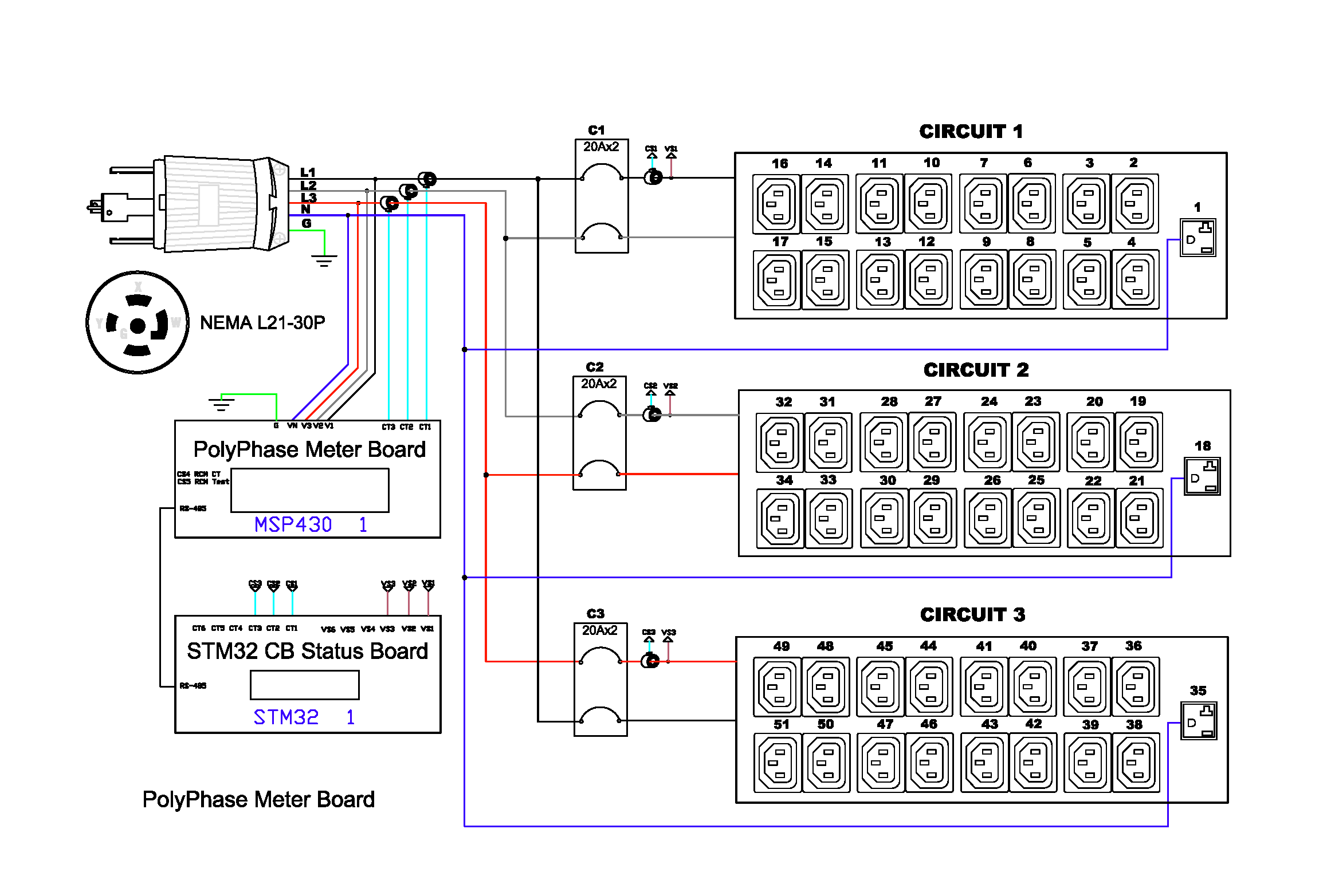Monitored rack power distribution unit (0U [vertical], 8.6kVA, 51 outlets). INPUT: 208v (3-phase WYE), 30a - NEMA L21-30P plug (4P5W); OUTPUT: 48@ C13, 3@ 5-20R outlets; on 3@ 2-pole, 20a Overcurrent Protectors; FEATURES: Billing-Grade (+/- 1%) Energy Metering [kW, kVA, V, A, Power Factor] - per inlet, per breaker/fuse; Remote network monitoring via HTML, JSON-RPC, SSH, Telnet, MODBUS/TCP, and SNMPv3. Onboard embedded processor with minimum 536MHz clock speed, 16MB SPI Flash, and 64MB DDR2 RAM. Cascading upto 16 PDU's using single Ethernet or USB connection. Environmental monitoring [temp/humidity] capable – up to 32 sensors. Individual outlet numbers labeled on chassis. Automated deployment via TFTP, DHCP, SSH(CLI), or USB Flash Drives. WiFi Capable. USB Webcam Capable. iPad/iPhone/Android App. Dual 10/100/1000 Ethernet port. Breaker metering and alarming (0V detection). Max Dimensions 52mm x 55mm x 1867mm (2.1in x 2.2in x 73.5in). Max Weight 7.7 kg. Maximum ambient temperature 60C at full load.