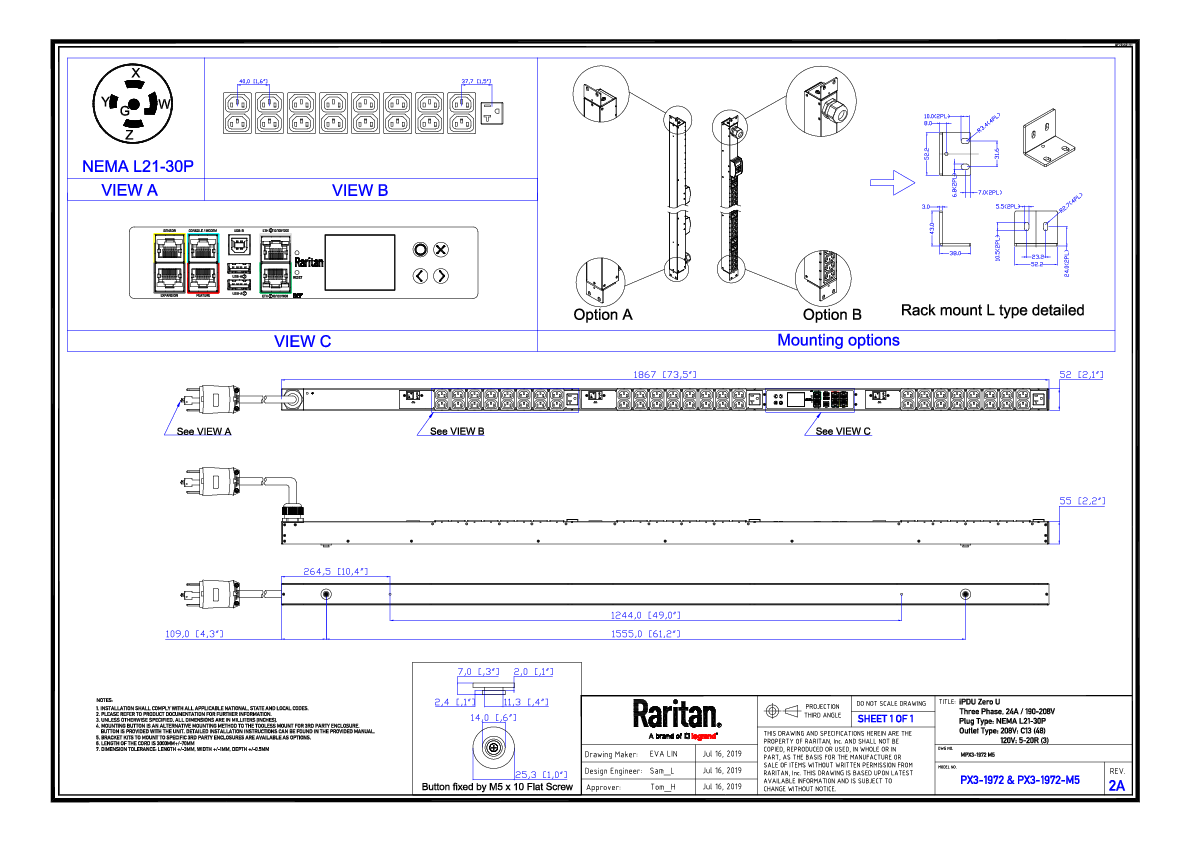 3PH, 208V AC, 30A (24A/PH rated); 51 outlets: 48x C13, 3x NEMA 5-20R; plug: NEMA L21-30P (Wye Bottom-front feed), 8.6kVA; Unit Metered, Zero U vertical PDU