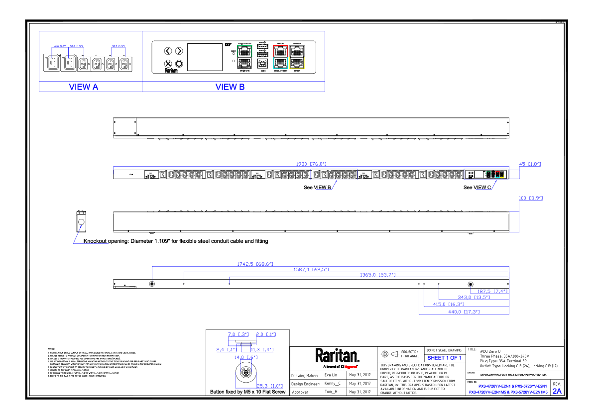 3PH, 208V AC, 44A (35A/PH rated); 36 outlets: 24x C13 Locking, 12x C19 Locking; plug: AC Terminal (Delta Bottom-bottom feed), 12.6kVA; Outlet Metered, Zero U vertical PDU