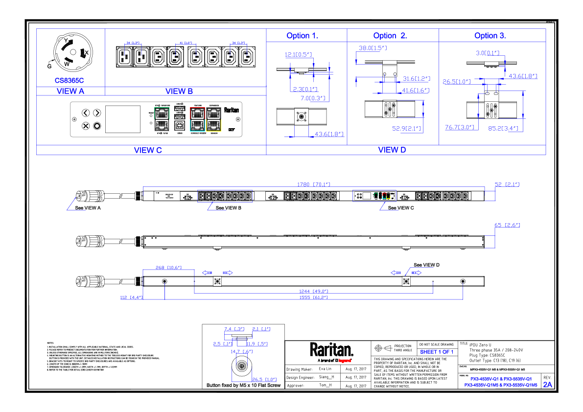 3PH, 208V AC, 50A (35A/PH rated); 24 outlets: 18x C13, 6x C19; plug: Hubbell CS8365C (Delta Bottom-bottom feed), 12.6kVA; Outlet Metered, Zero U vertical PDU