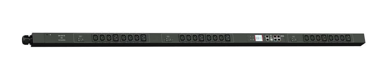 Monitored rack power distribution unit (0U [vertical], 12.6kVA, 24 outlets). INPUT: 208v (3-phase DELTA), 50a - CS8365C plug (3P4W); OUTPUT: 18@ C13, 6@ C19 outlets; on 3@ 2-pole, 20a Overcurrent Protectors; FEATURES: Billing-Grade (+/- 1%) Energy Metering [kW, kVA, V, A, Power Factor] - per inlet, per breaker/fuse, per outlet; Remote network monitoring via HTML, JSON-RPC, SSH, Telnet, MODBUS/TCP, and SNMPv3. Onboard embedded processor with minimum 536MHz clock speed, 16MB SPI Flash, and 64MB DDR2 RAM. Cascading upto 16 PDU's using single Ethernet or USB connection. Environmental monitoring [temp/humidity] capable – up to 32 sensors. Individual outlet numbers labeled on chassis. Automated deployment via TFTP, DHCP, SSH(CLI), or USB Flash Drives. WiFi Capable. USB Webcam Capable. iPad/iPhone/Android App. Dual 10/100/1000 Ethernet port. Tri-color status LED per receptacle. Breaker metering and alarming (0V detection). Max Dimensions 52mm x 65mm x 1780mm (2.1in x 2.6in x 70.1in). Max Weight TBD. Maximum ambient temperature 60C at full load.