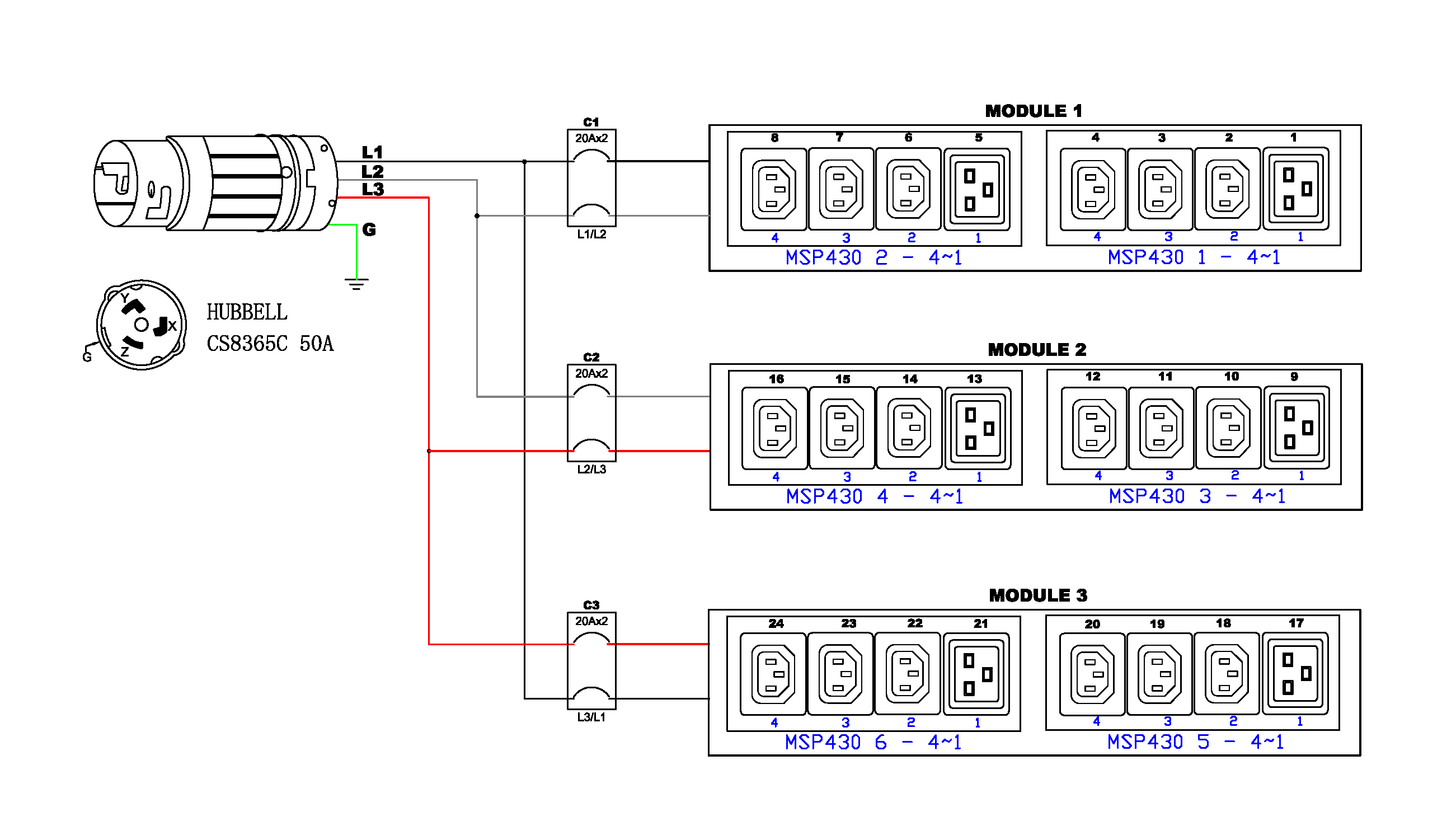 3PH, 208V AC, 50A (35A/PH rated); 24 outlets: 18x C13, 6x C19; plug: Hubbell CS8365C (Delta Bottom-bottom feed), 12.6kVA; Outlet Metered, Zero U vertical PDU