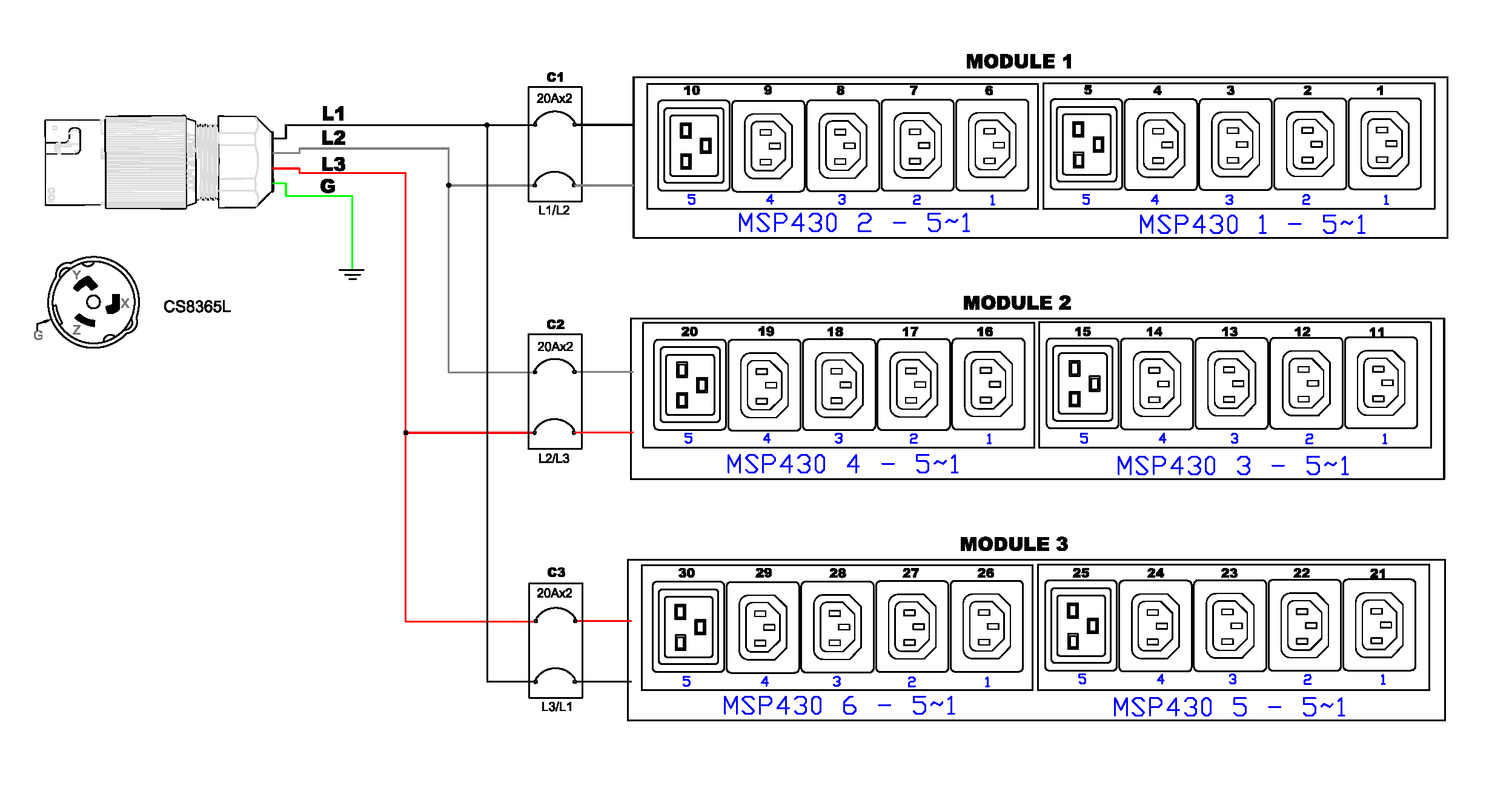 3PH, 208V AC, 50A (35A/PH rated); 30 outlets: 24x C13, 6x C19 PDU