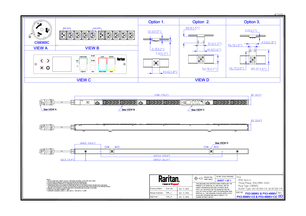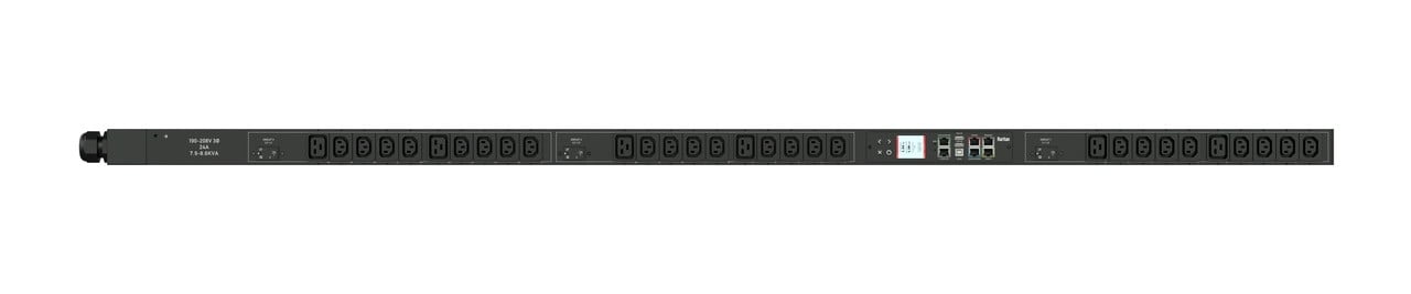 Monitored and switched rack power distribution unit (0U [vertical], 12.6kVA, 30 outlets). INPUT: 208v (3-phase DELTA), 50a - CS8365C plug (3P4W); OUTPUT: 24@ C13, 6@ C19 outlets; on 3@ 2-pole, 20a Overcurrent Protectors; FEATURES: Billing-Grade (+/- 1%) Energy Metering [kW, kVA, V, A, Power Factor] - per inlet, per breaker/fuse, per outlet; Remote Outlet Switching (Bi-State Latching Relays); Color, matrix LCD display : Voltage, current, or active power (per line, per breaker, or per receptacle / outlet); Alarms; Configuration information (name, ratings, IP / Networking information). Auto-flip orientation; Field-Replaceable, hot-swappable network module with 536MHz processor, 16MB SPI Flash, and 64MB DDR2 RAM; Gigabit(10/100/1000) Ethernet port. Secondary, redundant Ethernet port. Redundant power sharing between network modules.Remote network monitoring via HTML, JSON-RPC, SSH, Telnet, MODBUS/TCP, and SNMPv3. Environmental monitoring [temp/humidity] capable ñ up to 32 sensors. Individual outlet numbers labeled on chassis. Automated deployment via TFTP, DHCP/PXE, SSH(CLI), or USB Flash Drives. WiFi Capable. USB Webcam Capable. iPad/iPhone/Android App. Tri-color status LED per receptacle. Breaker metering and alarming (0V detection). Max Dimensions 52mm x 65mm x 1780mm (2.1in x 2.6in x 70.1in). Max Weight 7.9 kg. Maximum ambient temperature 60C at full load.
