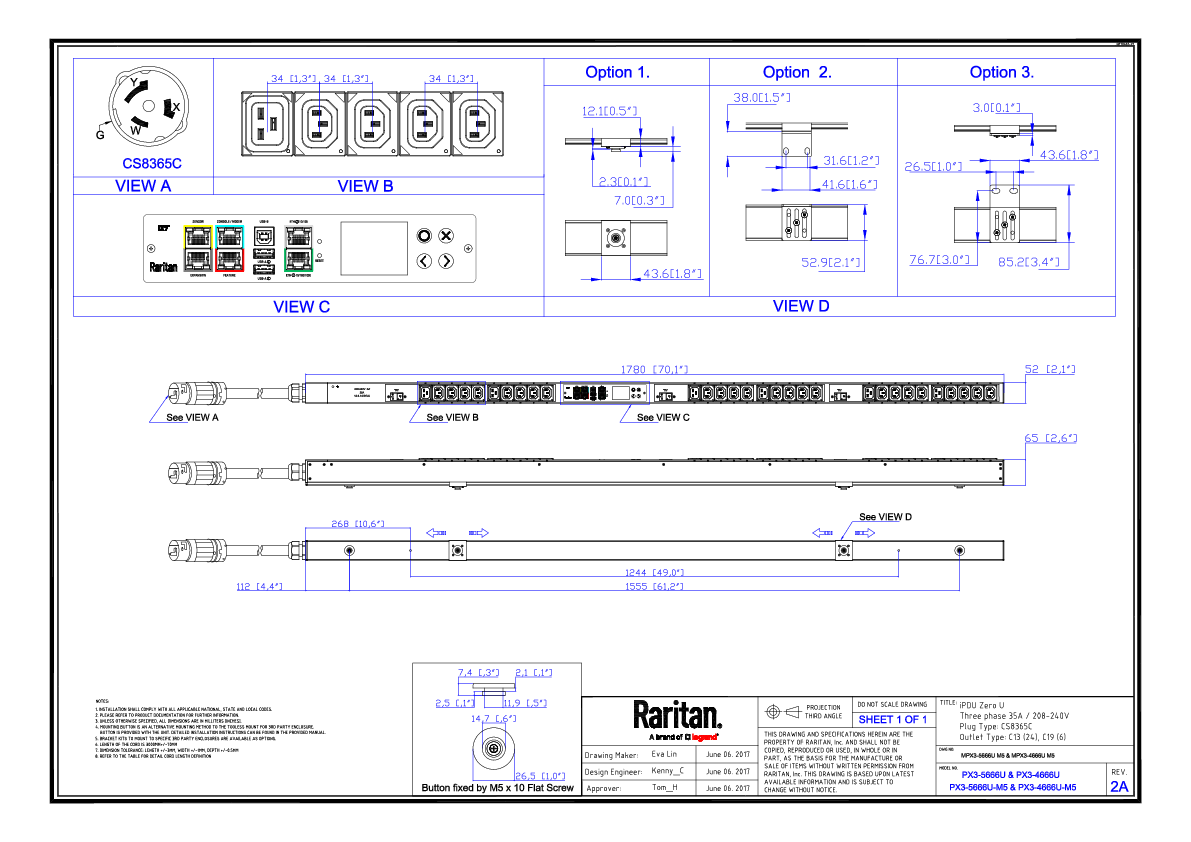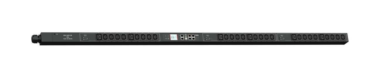 3PH, 208V AC, 50A (35A/PH rated); 30 outlets: 24x C13, 6x C19; plug: Hubbell CS8365C (Delta Top-top feed), 12.6kVA; Outlet Metered/Switched, Zero U vertical PDU