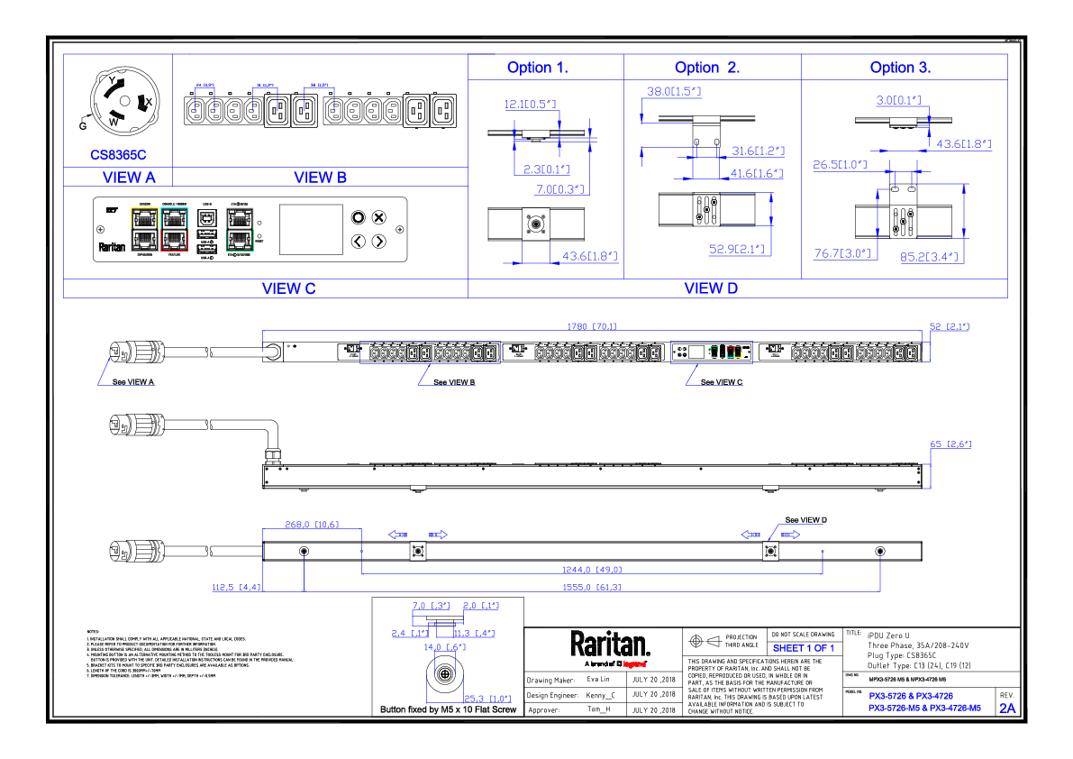 Monitored and switched rack power distribution unit (0U [vertical], 12.6kVA, 36 outlets). INPUT: 208v (3-phase DELTA), 50a - CS8365C plug (3P4W); OUTPUT: 24@ C13, 12@ C19 outlets; on 3@ 2-pole, 20a Overcurrent Protectors; FEATURES: Billing-Grade (+/- 1%) Energy Metering [kW, kVA, V, A, Power Factor] - per inlet, per breaker/fuse, per outlet; Remote network monitoring via HTML, JSON-RPC, SSH, Telnet, MODBUS/TCP, and SNMPv3. Onboard embedded processor with minimum 536MHz clock speed, 16MB SPI Flash, and 64MB DDR2 RAM. Cascading upto 16 PDU's using single Ethernet or USB connection. Environmental monitoring [temp/humidity] capable – up to 32 sensors. Individual outlet numbers labeled on chassis. Automated deployment via TFTP, DHCP, SSH(CLI), or USB Flash Drives. WiFi Capable. USB Webcam Capable. iPad/iPhone/Android App. Dual 10/100/1000 Ethernet port. Tri-color status LED per receptacle. Breaker metering and alarming (0V detection). Max Dimensions 52mm x 65mm x 1780mm (2.1in x 2.6in x 70.1in). Max Weight TBD. Maximum ambient temperature 60C at full load.