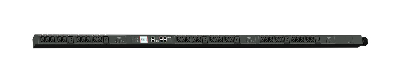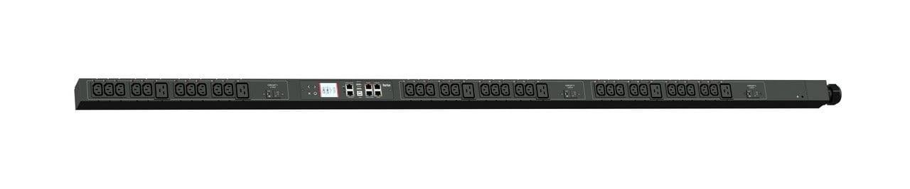 Monitored and switched rack power distribution unit (0U [vertical], 12.6kVA, 36 outlets). INPUT: 208v (3-phase DELTA), 50a - CS8365C plug (3P4W); OUTPUT: 30@ C13, 6@ C19 outlets; on 3@ 2-pole, 20a Overcurrent Protectors; FEATURES: Billing-Grade (+/- 1%) Energy Metering [kW, kVA, V, A, Power Factor] - per inlet, per breaker/fuse, per outlet; Remote network monitoring via HTML, JSON-RPC, SSH, Telnet, MODBUS/TCP, and SNMPv3. Onboard embedded processor with minimum 536MHz clock speed, 16MB SPI Flash, and 64MB DDR2 RAM. Cascading upto 16 PDU's using single Ethernet or USB connection. Environmental monitoring [temp/humidity] capable – up to 32 sensors. Individual outlet numbers labeled on chassis. Automated deployment via TFTP, DHCP, SSH(CLI), or USB Flash Drives. WiFi Capable. USB Webcam Capable. iPad/iPhone/Android App. Dual 10/100/1000 Ethernet port. Tri-color status LED per receptacle. Breaker metering and alarming (0V detection). Max Dimensions 52mm x 65mm x 1780mm (2.1in x 2.6in x 70.1in). Max Weight 8.3 kg. Maximum ambient temperature 60C at full load.