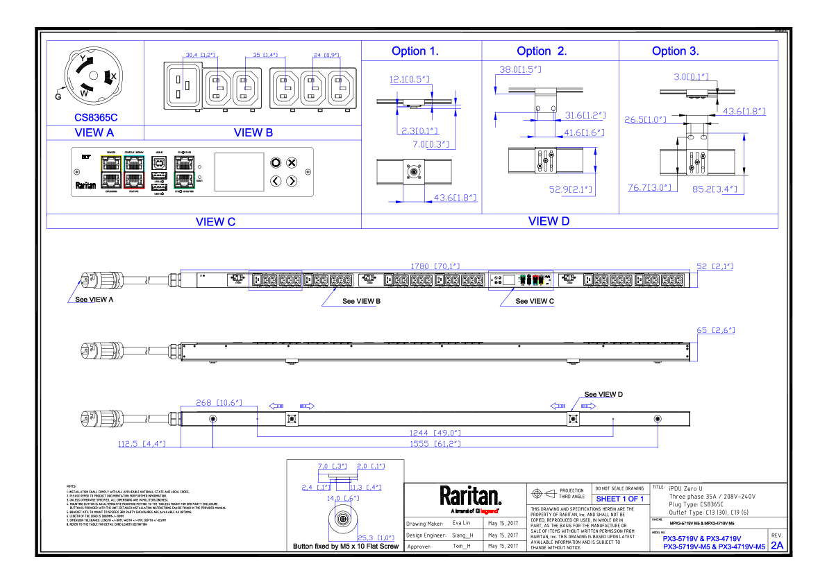 3PH, 208V AC, 50A (35A/PH rated); 36 outlets: 30x C13, 6x C19; plug: Hubbell CS8365C (Delta Bottom-bottom feed), 12.6kVA; Outlet Metered/Switched, Zero U vertical PDU