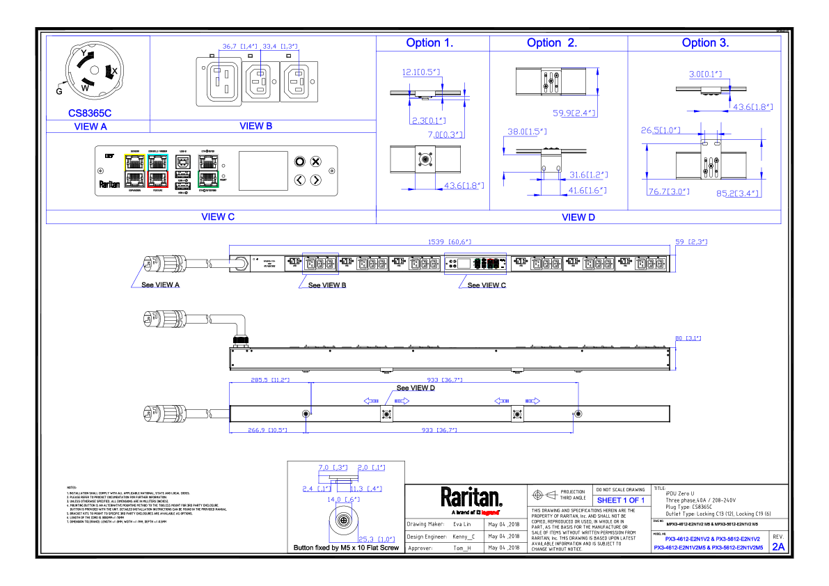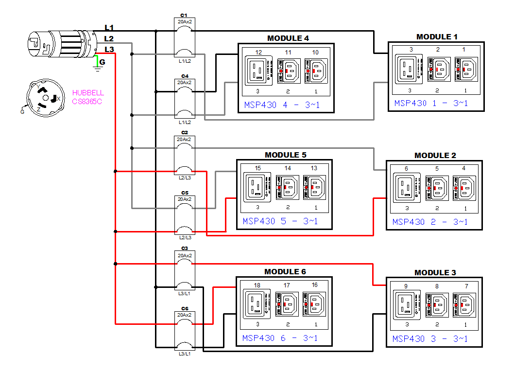 3PH, 208V AC, 50A (40A/PH rated); 18 outlets: 12x C13 Locking, 6x C19 Locking; plug: Hubbell CS8365C (Delta Bottom-front feed), 14.4kVA; Outlet Metered, Zero U vertical PDU
