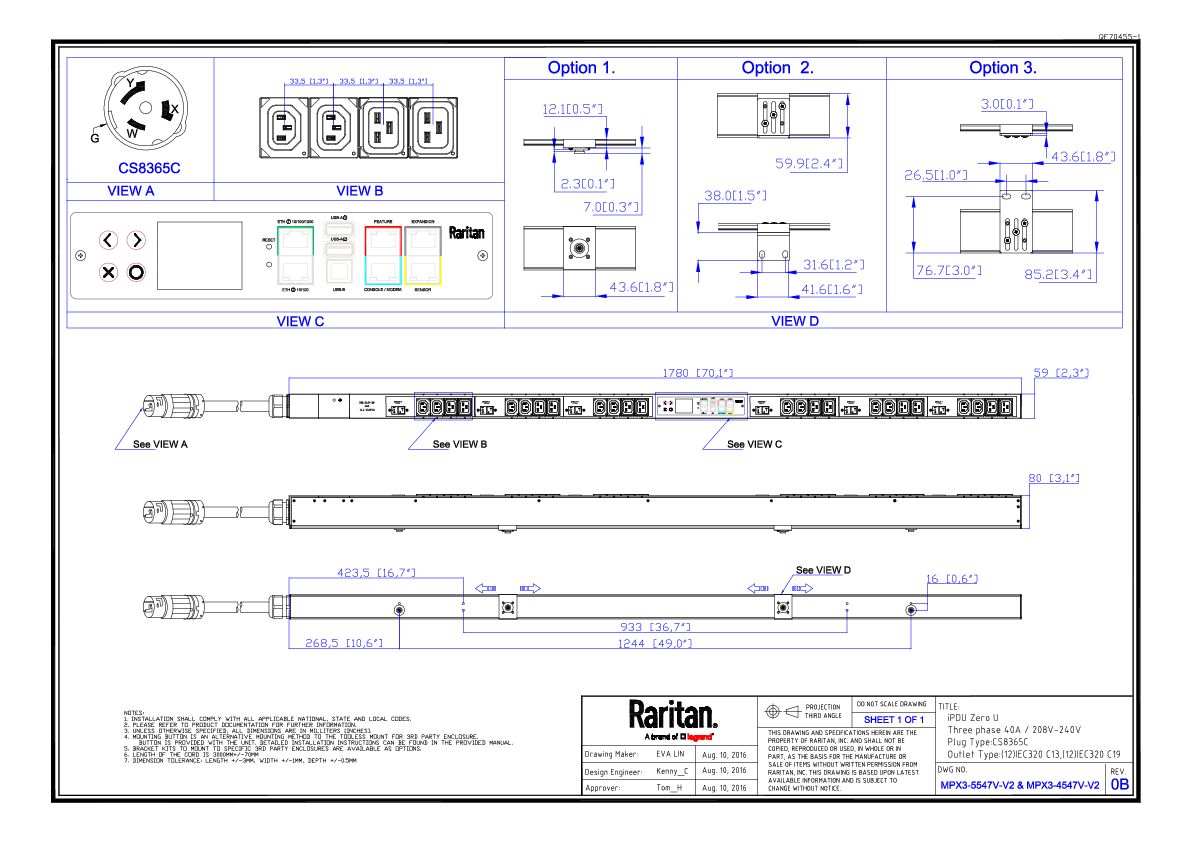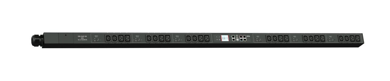 3PH, 208V AC, 50A (40A/PH rated); 24 outlets: 12x C13, 12x C19; plug: Hubbell CS8365C (Delta Bottom-bottom feed), 14.4kVA; Outlet Metered/Switched, Zero U vertical PDU
