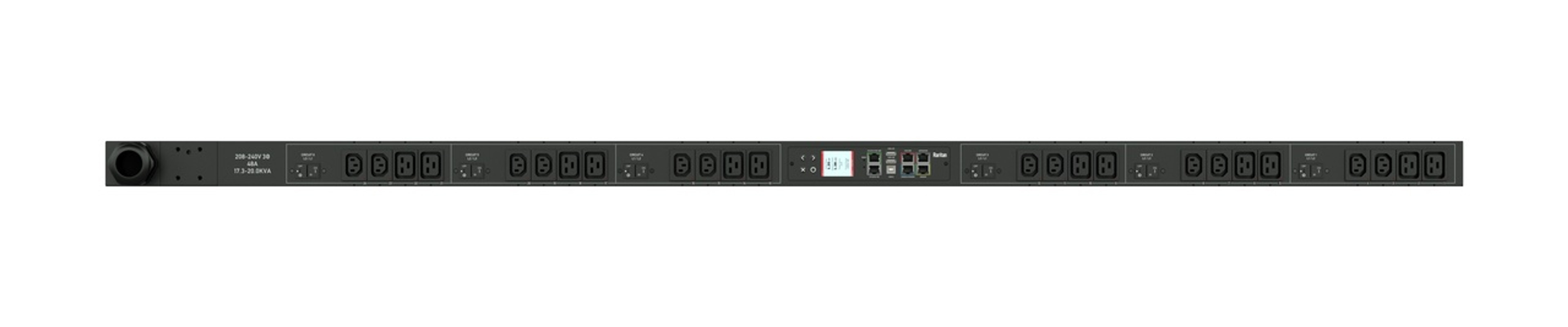 Monitored rack power distribution unit (0U [vertical], 14.4kVA, 24 outlets). INPUT: 208v (3-phase DELTA), 50a - CS8365C plug (3P4W); OUTPUT: 12@ C13, 12@ C19 outlets; on 6@ 2-pole, 20a Overcurrent Protectors; FEATURES: Billing-Grade (+/- 1%) Energy Metering [kW, kVA, V, A, Power Factor] - per inlet, per breaker/fuse, per outlet; Remote network monitoring via HTML, JSON-RPC, SSH, Telnet, MODBUS/TCP, and SNMPv3. Onboard embedded processor with minimum 536MHz clock speed, 16MB SPI Flash, and 64MB DDR2 RAM. Cascading upto 16 PDU's using single Ethernet or USB connection. Environmental monitoring [temp/humidity] capable – up to 32 sensors. Individual outlet numbers labeled on chassis. Automated deployment via TFTP, DHCP, SSH(CLI), or USB Flash Drives. WiFi Capable. USB Webcam Capable. iPad/iPhone/Android App. Dual 10/100/1000 Ethernet port. Tri-color status LED per receptacle. Breaker metering and alarming (0V detection). Max Dimensions 59mm x 80mm x 1780mm (2.3in x 3.2in x 70.1in). Max Weight TBD. Maximum ambient temperature 60C at full load.