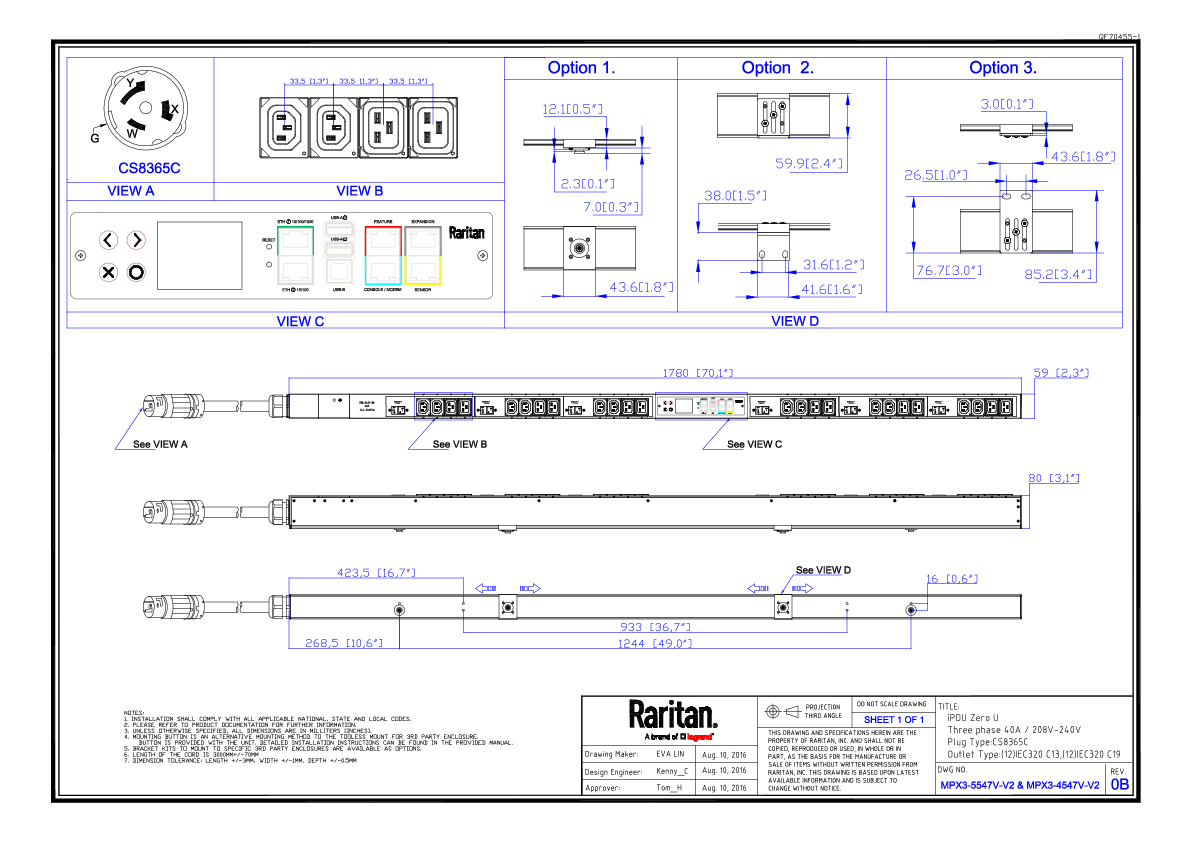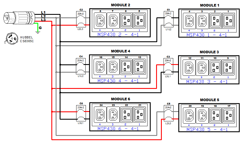 3PH, 208V AC, 50A (40A/PH rated); 24 outlets: 12x C13, 12x C19; plug: Hubbell CS8365C (Delta Bottom-bottom feed), 14.4kVA; Outlet Metered, Zero U vertical PDU