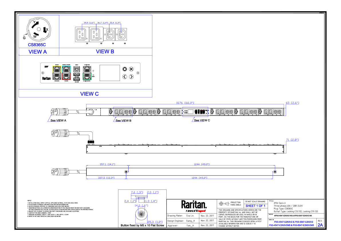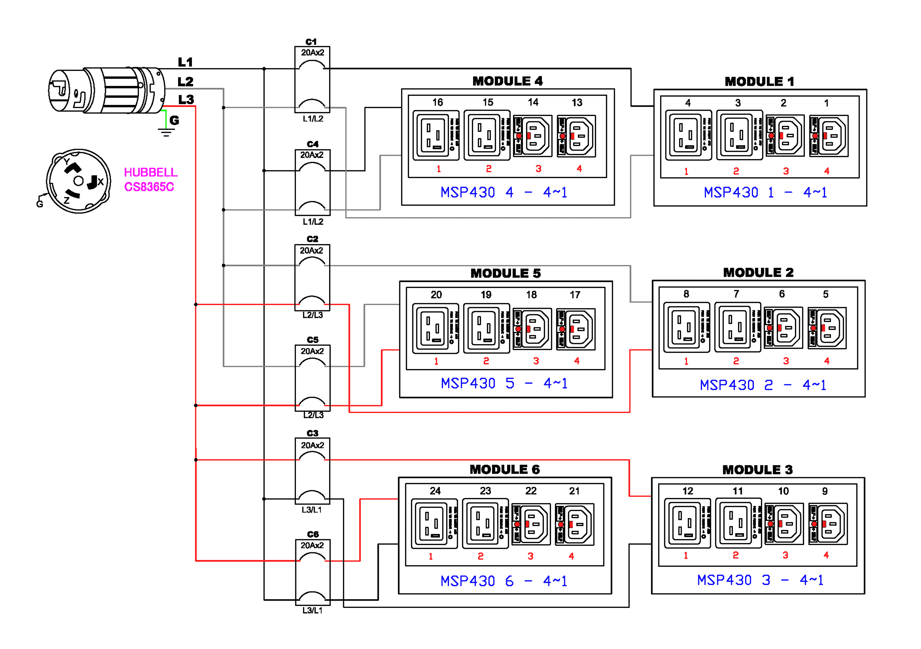 3PH, 208V AC, 50A (40A/PH rated); 24 outlets: 12x C13 Locking, 12x C19 Locking; plug: Hubbell CS8365C (Delta Bottom-front feed), 14.4kVA; Outlet Metered, Zero U vertical PDU
