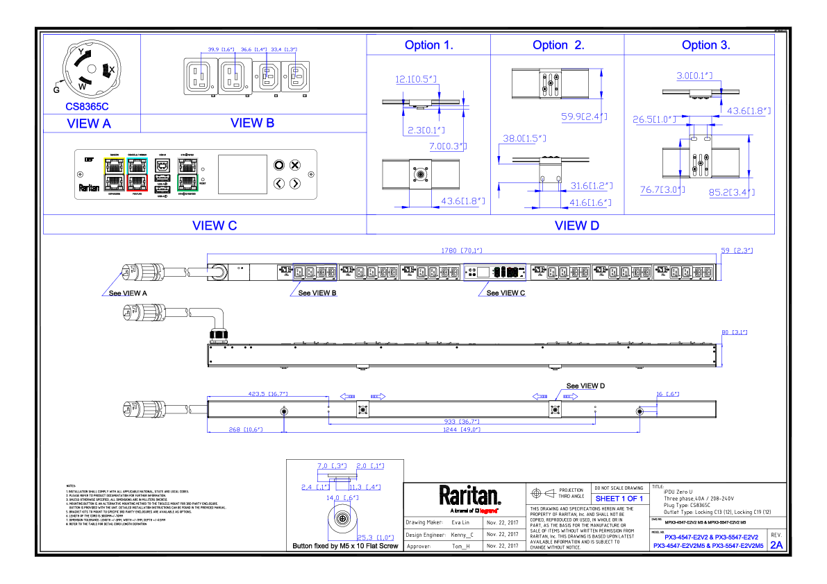3PH, 208V AC, 50A (40A/PH rated); 24 outlets: 12x C13 Locking, 12x C19 Locking; plug: Hubbell CS8365C (Delta Bottom-front feed), 14.4kVA; Outlet Metered, Zero U vertical PDU