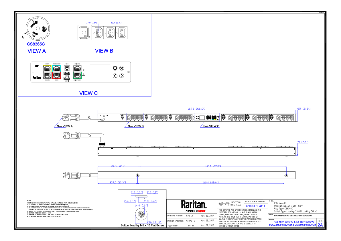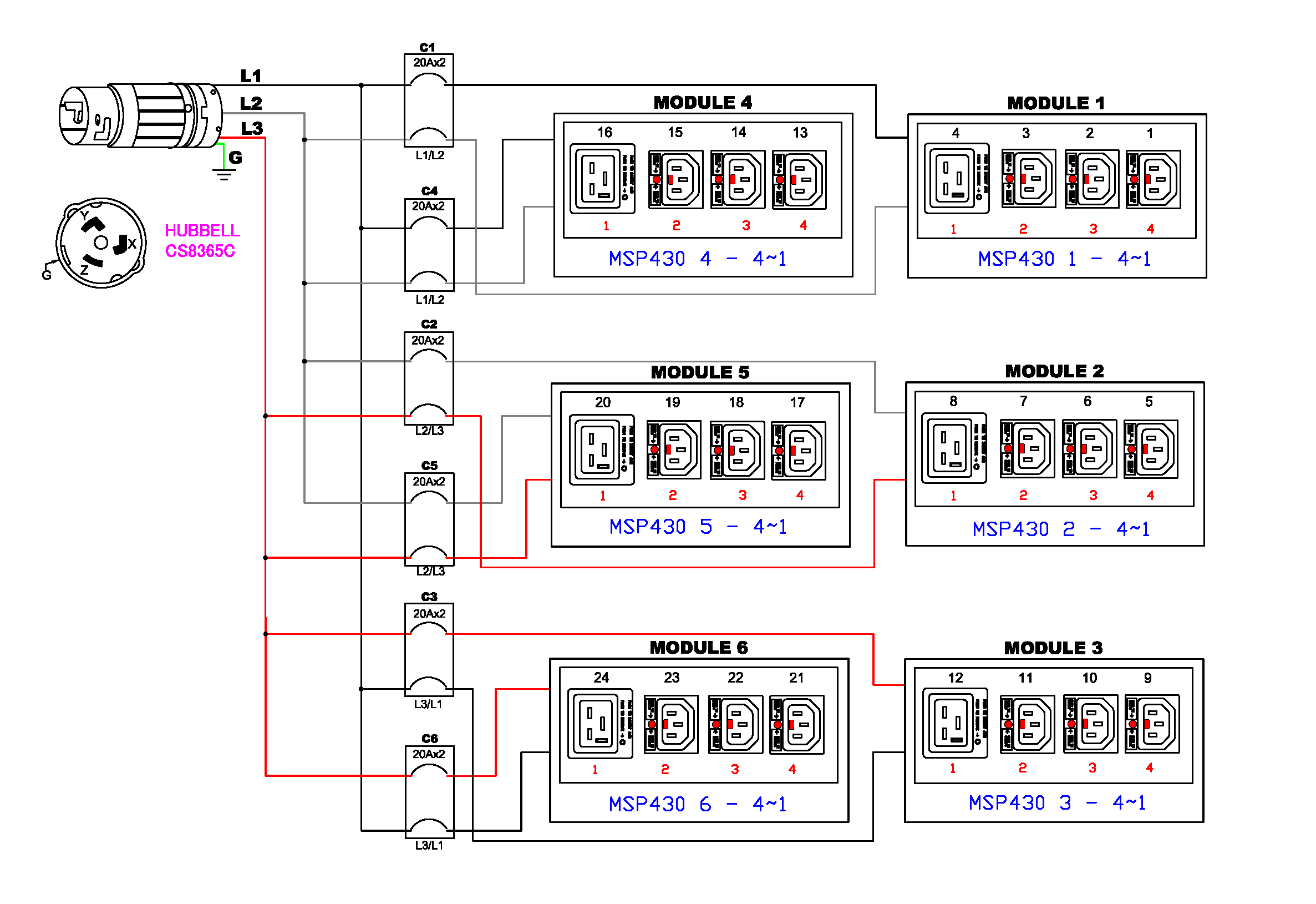 3PH, 208V AC, 50A (40A/PH rated); 24 outlets: 18x C13 Locking , 6x C19 Locking; plug: Hubbell CS8365C (Delta Bottom-front feed), 14.6kVA; Outlet Metered/Switched, Zero U vertical PDU