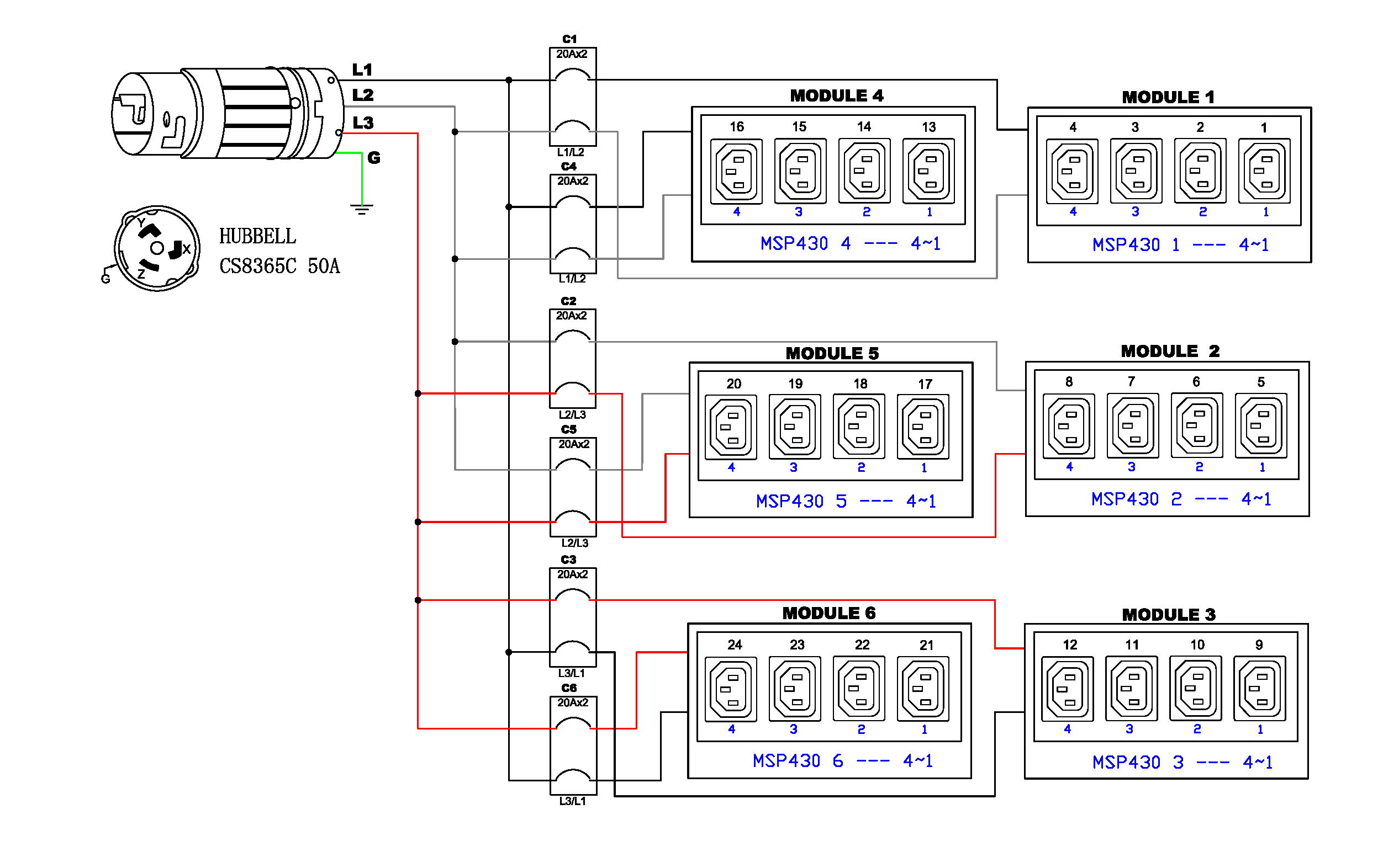 3PH, 208V AC, 50A (40A/PH rated); 24 outlets: 24x C13; plug: Hubbell CS8365C (Delta Bottom-bottom feed), 14.4kVA; Outlet Metered, Zero U vertical PDU