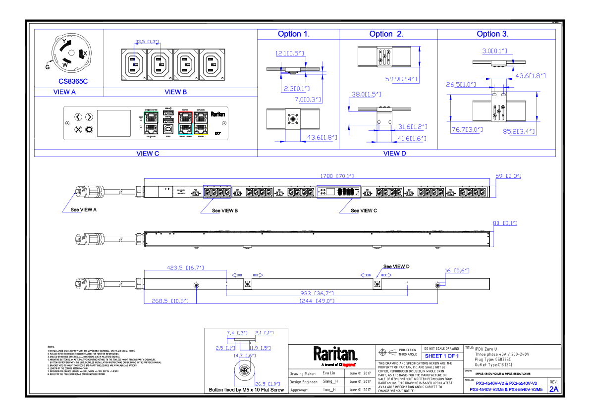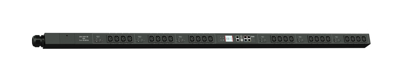 3PH, 208V AC, 50A (40A/PH rated); 24 outlets: 24x C13; plug: Hubbell CS8365C (Delta Bottom-bottom feed), 14.4kVA; Outlet Metered, Zero U vertical PDU