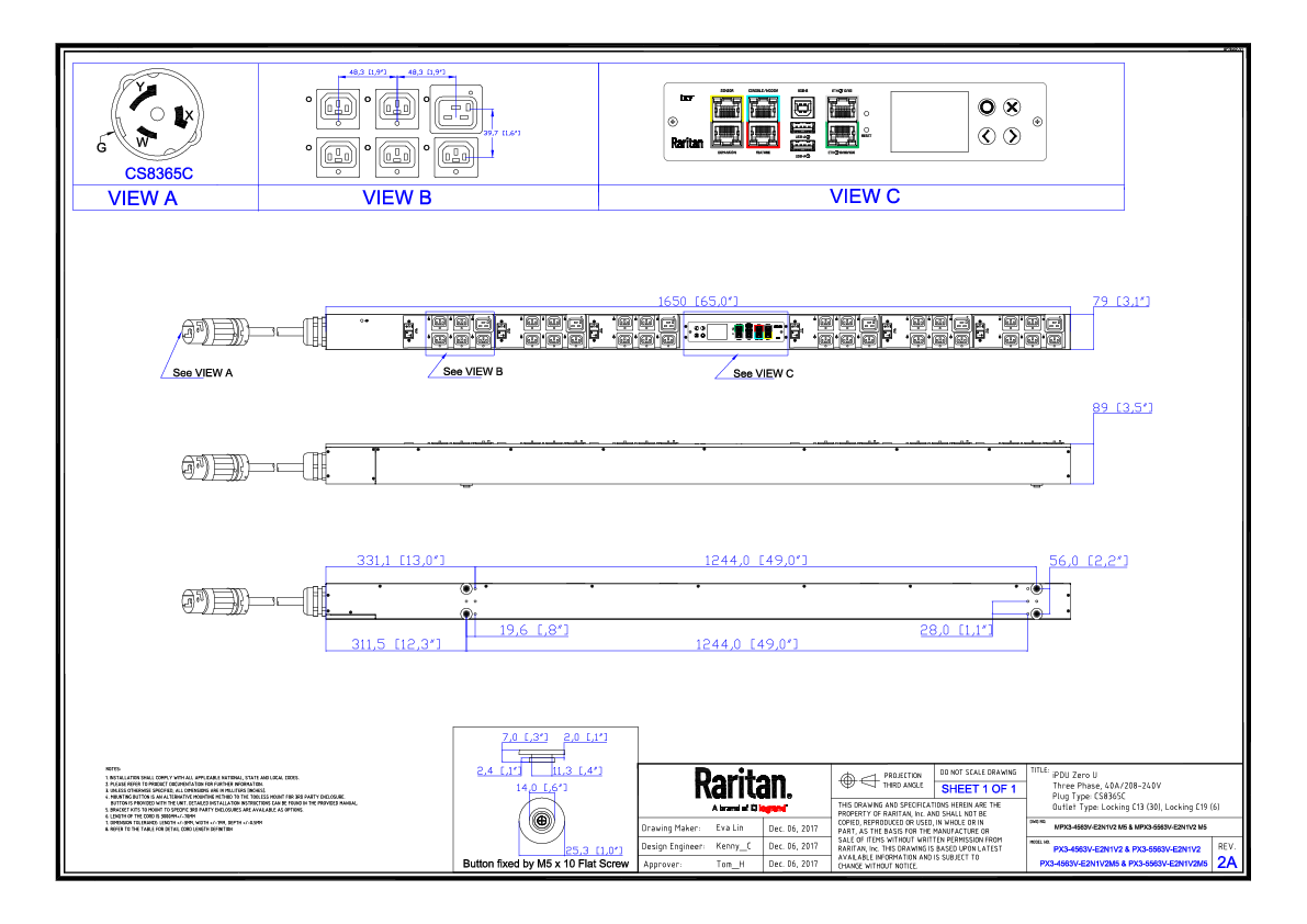 3PH, 208V AC, 50A (40A/PH rated); 36 outlets: 30x C13 Locking, 6x C19 Locking; plug: Hubbell CS8365C (Delta Bottom-bottom feed), 14.4kVA; Outlet Metered, Zero U vertical PDU, V2 Outlet Sequence, high resolution color display with field replaceable controller, Ethernet, serial, 2x USB-A, USB-B and sensor connections