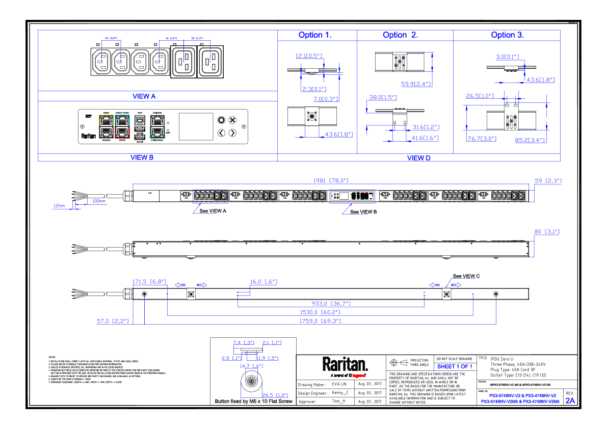 3PH, 208V AC, 50A (40A/PH rated); 36 outlets: 24x C13, 12x C19; plug: Cord (Delta Bottom-bottom feed), 14.4kVA; Outlet Metered, Zero U vertical PDU