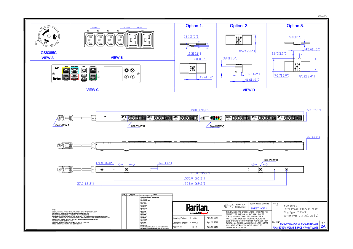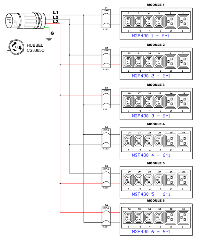 3PH, 208V AC, 50A (40A/PH rated); 36 outlets: 24x C13, 12x C19; plug: Hubbell CS8365C (Delta Bottom-bottom feed), 14.4kVA; Outlet Metered/Switched, Zero U vertical PDU