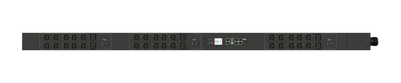 Monitored rack power distribution unit (0U [vertical], 14.4kVA, 36 outlets). INPUT: 208v (3-phase DELTA), 50a - CS8365C plug (3P4W); OUTPUT: 24@ C13, 12@ C19 outlets; on 6@ 2-pole, 20a Overcurrent Protectors; FEATURES: Billing-Grade (+/- 1%) Energy Metering [kW, kVA, V, A, Power Factor] - per inlet, per breaker/fuse; Remote network monitoring via HTML, JSON-RPC, SSH, Telnet, MODBUS/TCP, and SNMPv3. Onboard embedded processor with minimum 536MHz clock speed, 16MB SPI Flash, and 64MB DDR2 RAM. Cascading upto 16 PDU's using single Ethernet or USB connection. Environmental monitoring [temp/humidity] capable – up to 32 sensors. Individual outlet numbers labeled on chassis. Automated deployment via TFTP, DHCP, SSH(CLI), or USB Flash Drives. WiFi Capable. USB Webcam Capable. iPad/iPhone/Android App. Dual 10/100/1000 Ethernet port. Breaker metering and alarming (0V detection). Max Dimensions 45mm x 80mm x 1780mm (1.8in x 3.1in x 70.1in). Max Weight 10.6 kg. Maximum ambient temperature 60C at full load.