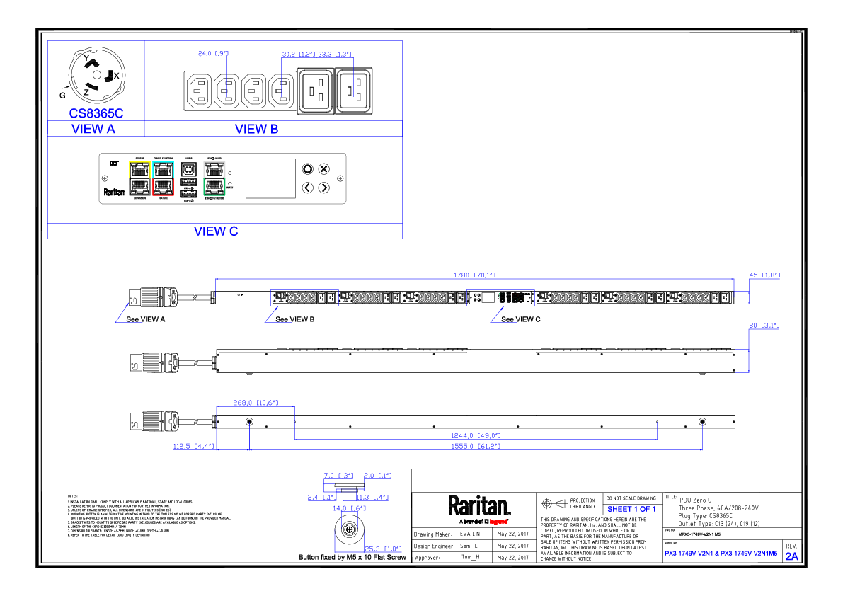 3PH, 208V AC, 50A (40A/PH rated); 36 outlets: 24x C13, 12x C19; plug: Hubbell CS8365C (Delta Bottom-bottom feed), 14.4kVA; Unit Metered, Zero U vertical PDU