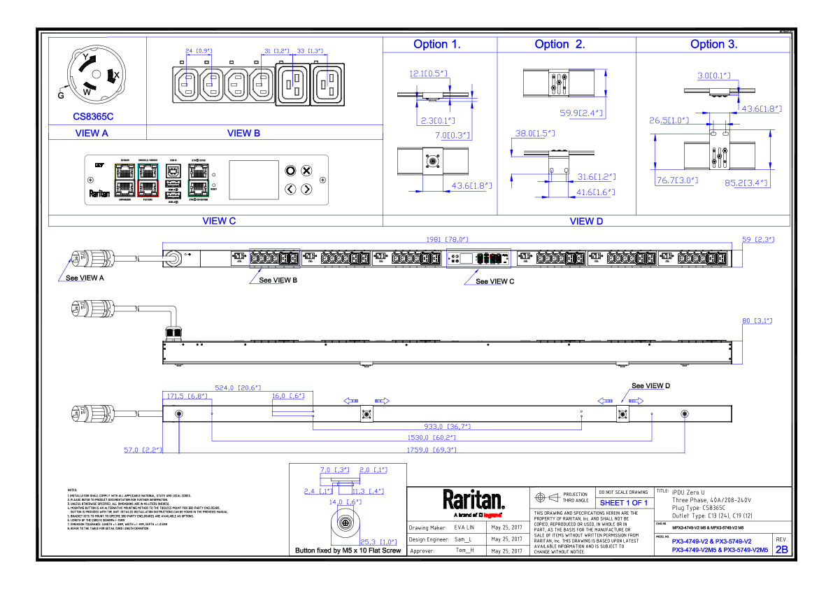 Monitored rack power distribution unit (0U [vertical], 14.4kVA, 36 outlets). INPUT: 208v (3-phase DELTA), 50a - CS8365C plug (3P4W); OUTPUT: 24@ C13, 12@ C19 outlets; on 6@ 2-pole, 20a Overcurrent Protectors; FEATURES: Billing-Grade (+/- 1%) Energy Metering [kW, kVA, V, A, Power Factor] - per inlet, per breaker/fuse, per outlet; Remote network monitoring via HTML, JSON-RPC, SSH, Telnet, MODBUS/TCP, and SNMPv3. Onboard embedded processor with minimum 536MHz clock speed, 16MB SPI Flash, and 64MB DDR2 RAM. Cascading upto 16 PDU's using single Ethernet or USB connection. Environmental monitoring [temp/humidity] capable – up to 32 sensors. Individual outlet numbers labeled on chassis. Automated deployment via TFTP, DHCP, SSH(CLI), or USB Flash Drives. WiFi Capable. USB Webcam Capable. iPad/iPhone/Android App. Dual 10/100/1000 Ethernet port. Tri-color status LED per receptacle. Breaker metering and alarming (0V detection). Max Dimensions 59mm x 80mm x 1981mm (2.3in x 3.1in x 78.0in). Max Weight TBD. Maximum ambient temperature 60C at full load.