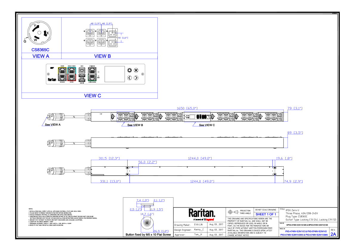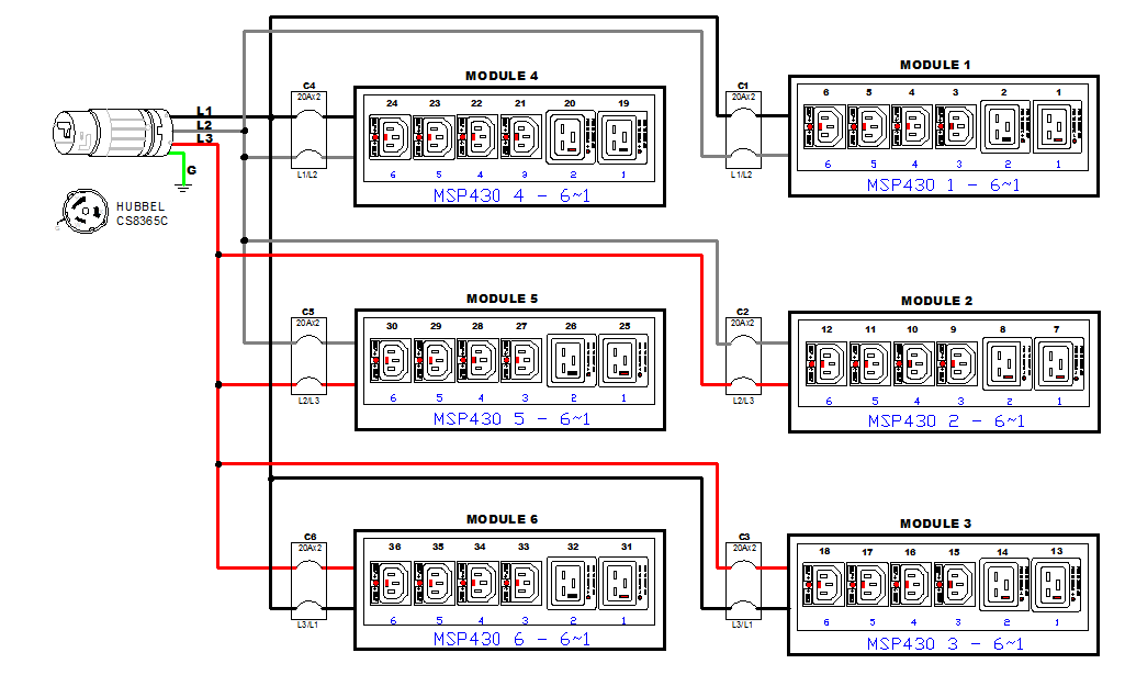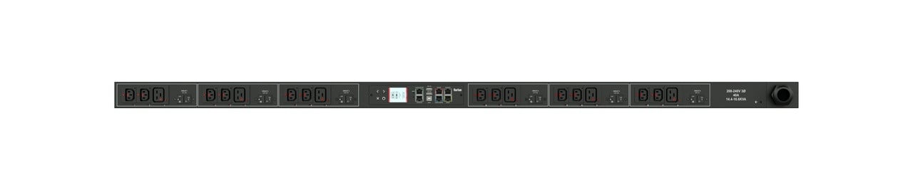 3PH, 208V AC, 50A (40A/PH rated); 36 outlets: 24x C13 Locking, 12x C19 Locking; plug: Hubbell CS8365C (Delta Bottom-bottom feed), 14.4kVA; Outlet Metered, Zero U vertical PDU