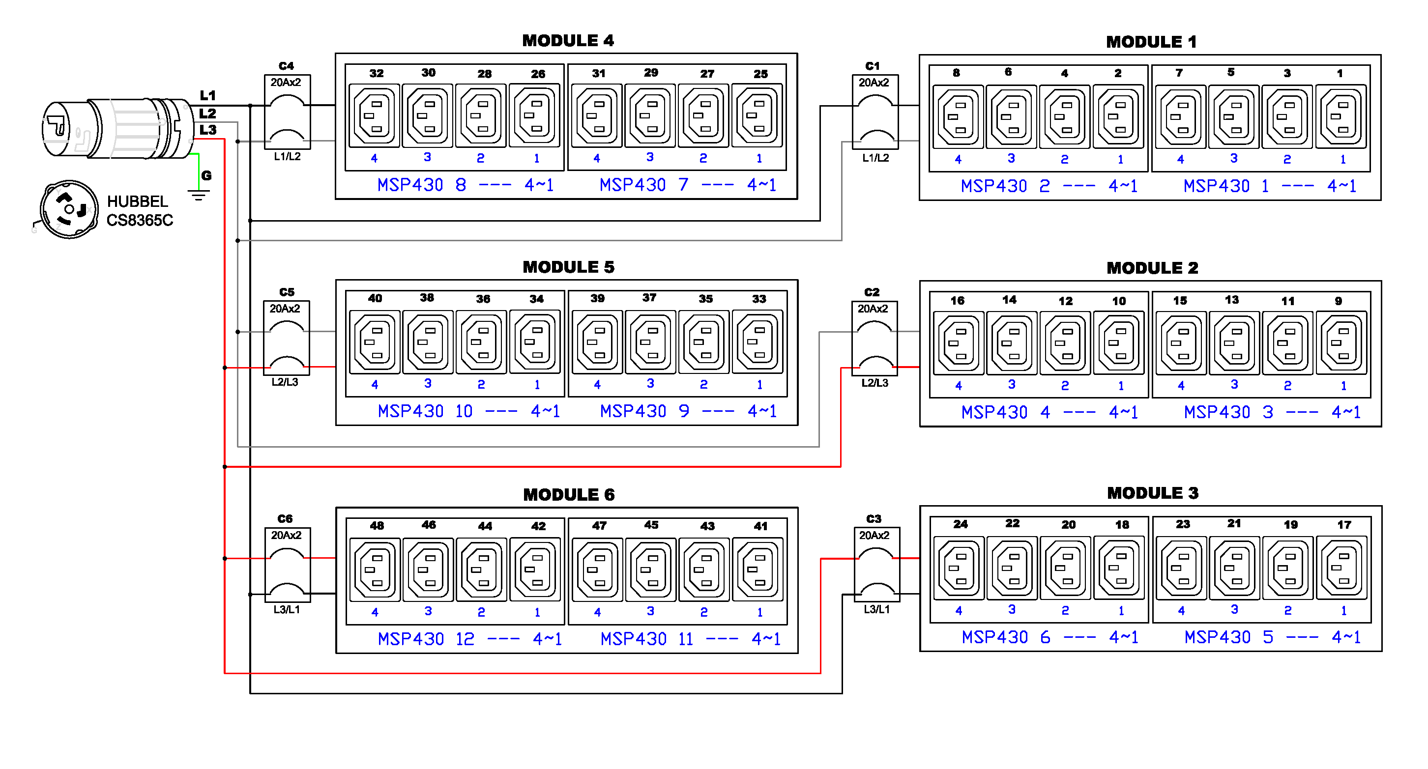 3PH, 208V AC, 50A (40A/PH rated); 48 outlets: 48x C13; plug: Hubbell CS8365C (Delta Bottom-bottom feed), 14.4kVA; Outlet Metered/Switched, Zero U vertical PDU