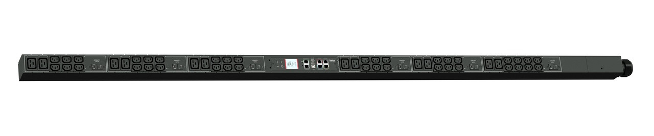 Monitored rack power distribution unit (0U [vertical], 14.4kVA, 50 outlets). INPUT: 208v (3-phase DELTA), 50a - CS8365C plug (3P4W); OUTPUT: 38@ C13, 4@ C19 outlets; on 6@ 2-pole, 20a Overcurrent Protectors; FEATURES: Billing-Grade (+/- 1%) Energy Metering [kW, kVA, V, A, Power Factor] - per inlet, per breaker/fuse; Remote network monitoring via HTML, JSON-RPC, SSH, Telnet, MODBUS/TCP, and SNMPv3. Onboard embedded processor with minimum 536MHz clock speed, 16MB SPI Flash, and 64MB DDR2 RAM. Cascading upto 16 PDU's using single Ethernet or USB connection. Environmental monitoring [temp/humidity] capable – up to 32 sensors. Individual outlet numbers labeled on chassis. Automated deployment via TFTP, DHCP, SSH(CLI), or USB Flash Drives. WiFi Capable. USB Webcam Capable. iPad/iPhone/Android App. Dual 10/100/1000 Ethernet port. Breaker metering and alarming (0V detection). Max Dimensions 59mm x 80mm x 1981mm (2.3in x 3.1in x 78.0in). Max Weight 15 kg. Maximum ambient temperature 60C at full load.