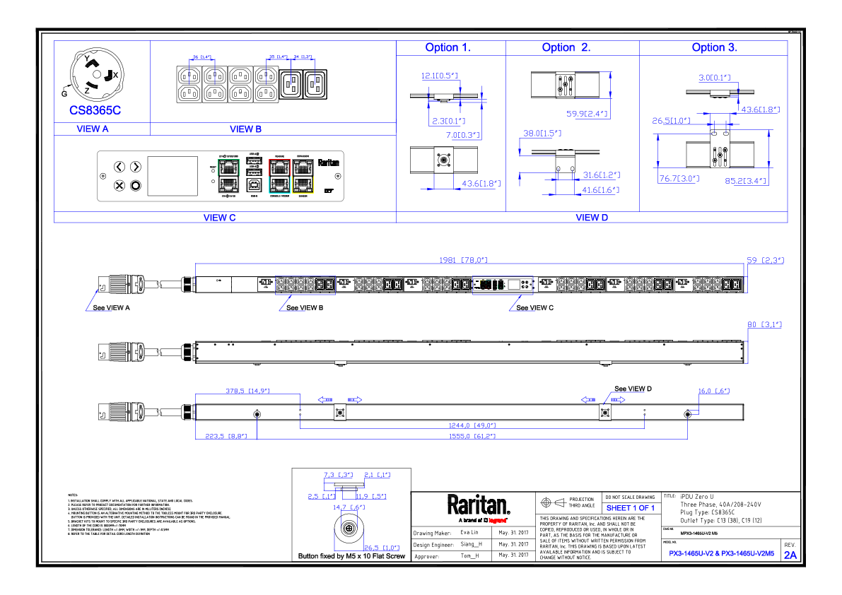 3PH, 208V AC, 50A (40A/PH rated); 50 outlets: 38x C13, 12x C19; plug: Hubbell CS8365C (Delta Top-top feed), 14.4kVA; Unit Metered, Zero U vertical PDU,