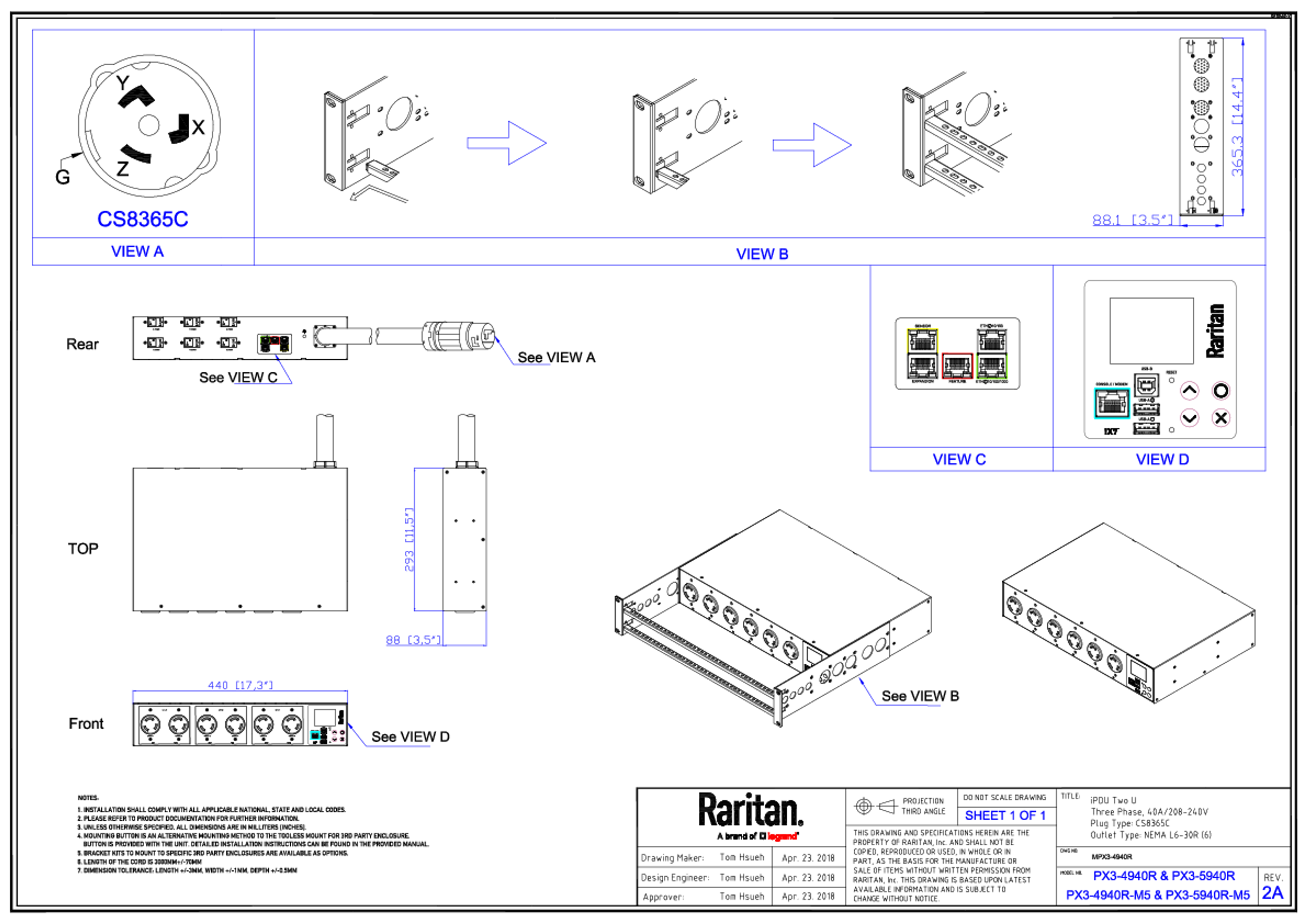 Raritan PX3-4940R 3PH 208V AC 50A 6 outlets 2U PDU