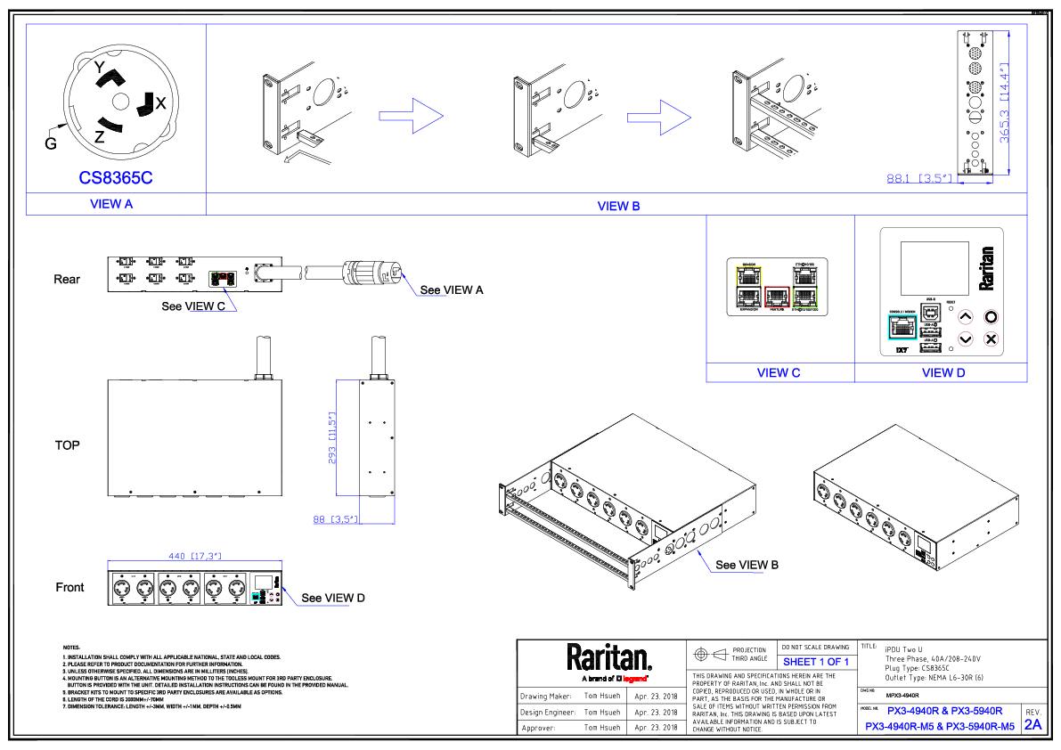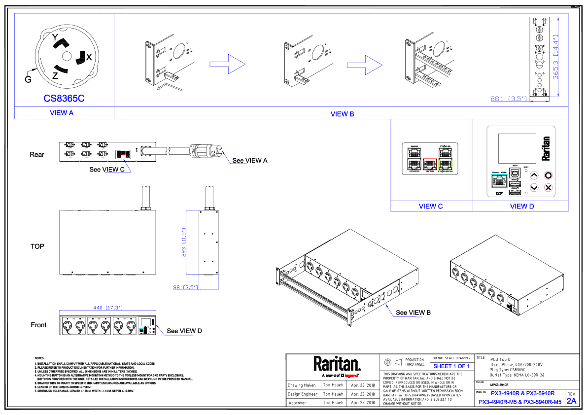 3PH, 208V AC, 50A (40A/PH rated); 6 outlets: 6x NEMA L6-30R; plug: CS8365C (Delta Rear feed), 14.4kVA; Outlet Metered, 2U horizontal PDU, high resolution color display