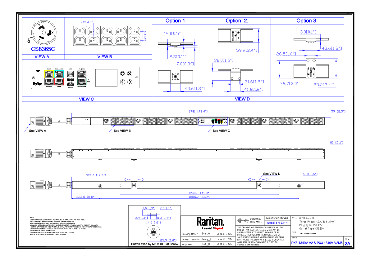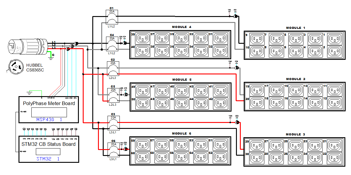 3PH, 208V AC, 50A (40A/PH rated); 60 outlets: 60x C13; plug: Hubbell CS8365C (Delta Bottom-bottom feed), 14.4kVA; Unit Metered, Zero U vertical PDU, SecureLock ready