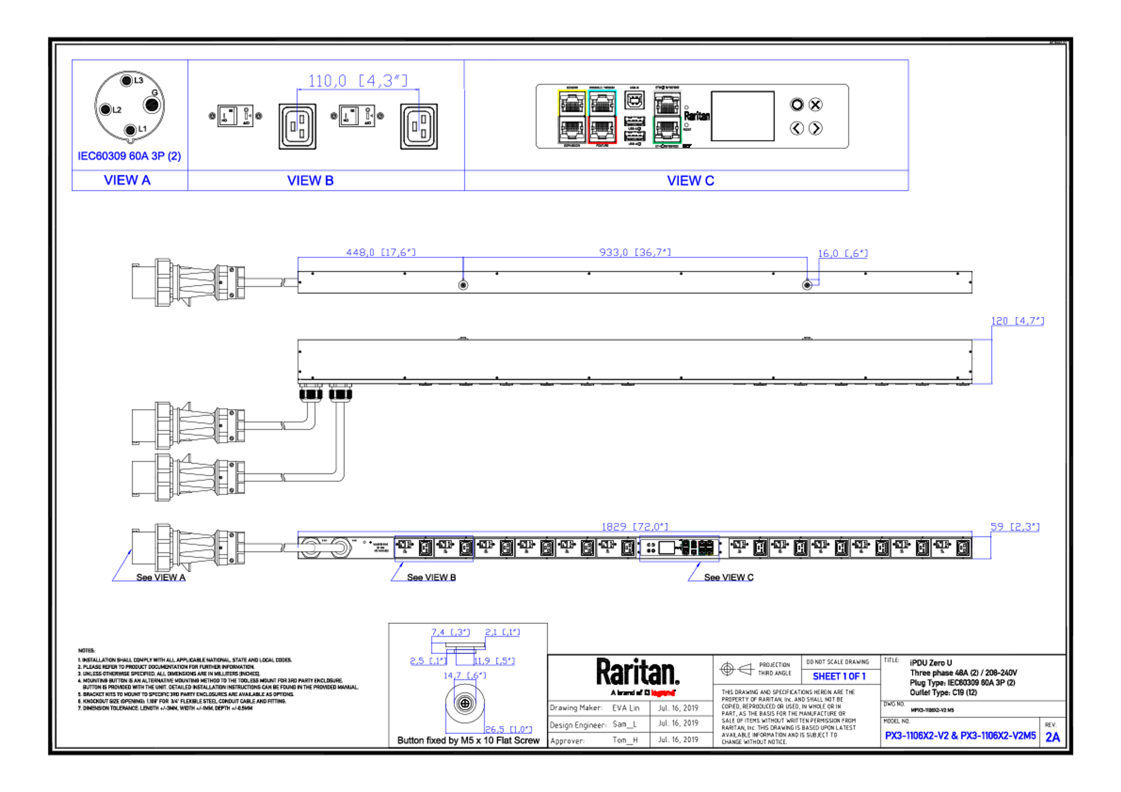3PH, 208V AC, 60A (48A/PH rated); 12 outlets: 12x C19; plug: IEC 60309 3P+E 9h 60A (Delta Bottom-front feed), 17.3kVA; Unit Metered, Zero U vertical PDU