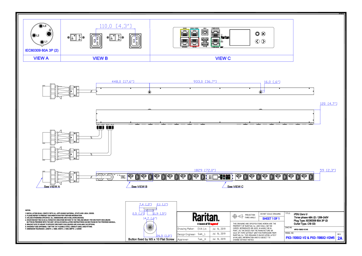 3PH, 208V AC, 60A (48A/PH rated); 12 outlets: 12x C19; plug: IEC 60309 3P+E 9h 60A (Delta Bottom-front feed), 17.3kVA; Unit Metered, Zero U vertical PDU