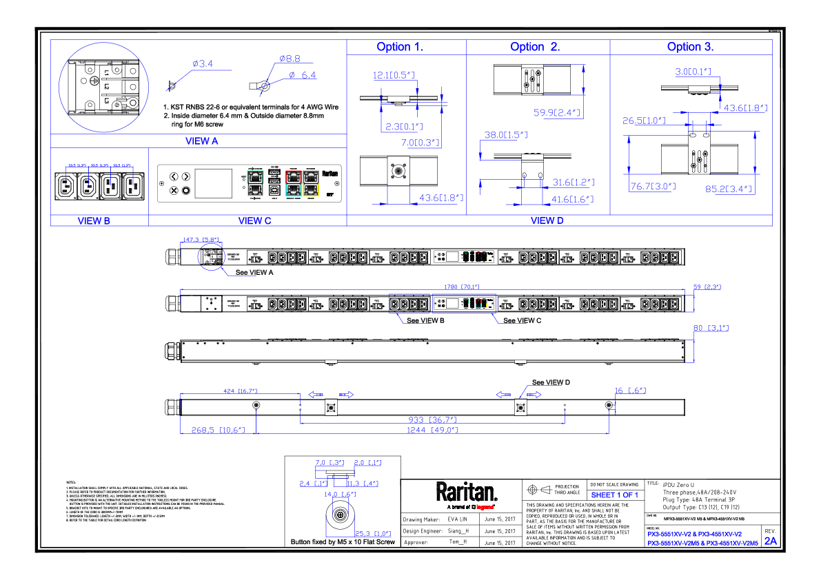 3PH, 208V AC, 60A (48A/PH rated); 24 outlets: 12x C13, 12x C19; plug: AC Terminal (Delta Bottom-bottom feed), 17.3kVA; Outlet Metered/Switched, Zero U vertical PDU