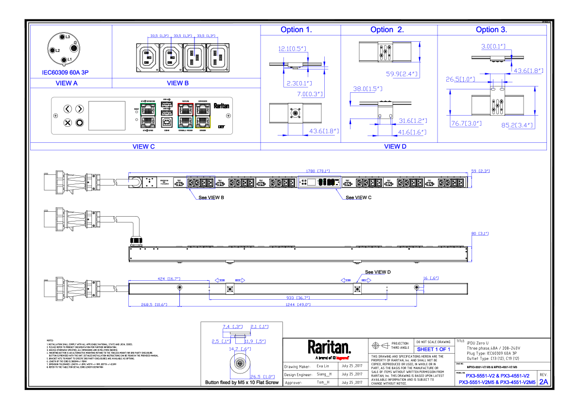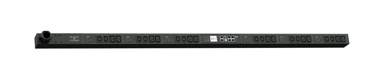 3PH, 208V AC, 60A (48A/PH rated); 24 outlets: 12x C13, 12x C19; plug: IEC 60309 3P+E 9h 60A (Delta Bottom-front feed), 17.3kVA; Outlet Metered/Switched, Zero U vertical PDU