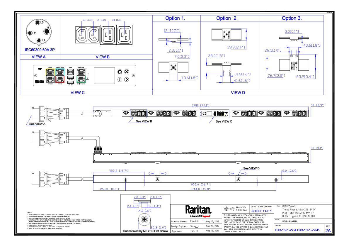3PH, 208V AC, 60A (48A/PH rated); 24 outlets: 12x C13, 12x C19; plug: IEC 60309 3P+E 9h 60A (Delta Bottom-front feed), 17.3kVA; Unit Metered, Zero U vertical PDU