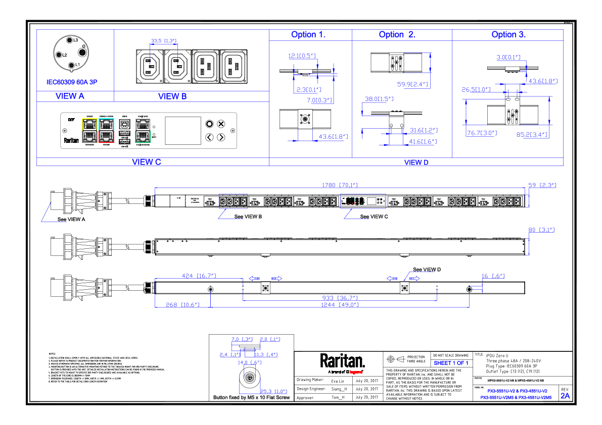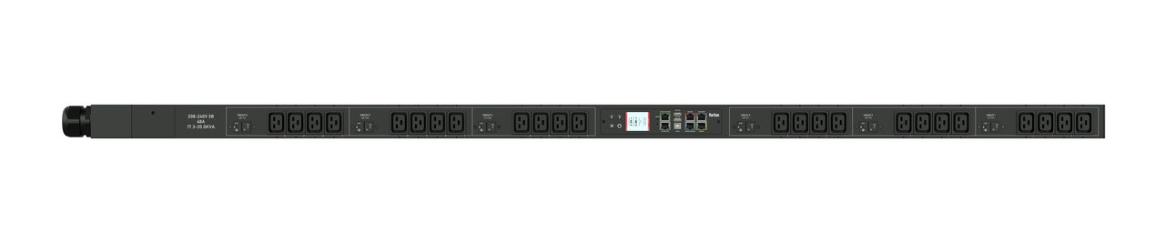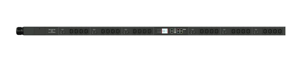 3PH, 208V AC, 60A (48A/PH rated); 24 outlets: 12x C13, 12x C19; plug: IEC 60309 3P+E 9h 60A (Delta Top-top feed), 17.3kVA; Outlet Metered/Switched, Zero U vertical PDU