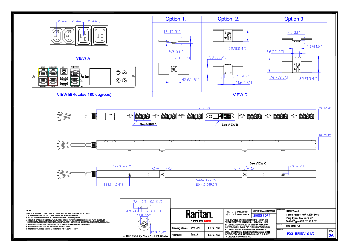 3PH, 208V AC, 60A (48A/PH rated); 24 outlets: 12x C13, 12x C19; plug: No Plug (Delta Bottom-front feed), 17.3kVA; Unit Metered, Zero U vertical PDU